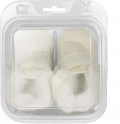 Capáčky jsou velmi lehké, s tenkou syntetickou podrážkou z PVC bez BPA – ideální pro kočárek, cestování i odpočinek. Délka vnitřní stélky je 10 cm, doporučeno pro věk 0–3 měsíce. Dodáváno v praktické dárkové krabičce, skvělé také jako dárek pro novorozence.