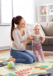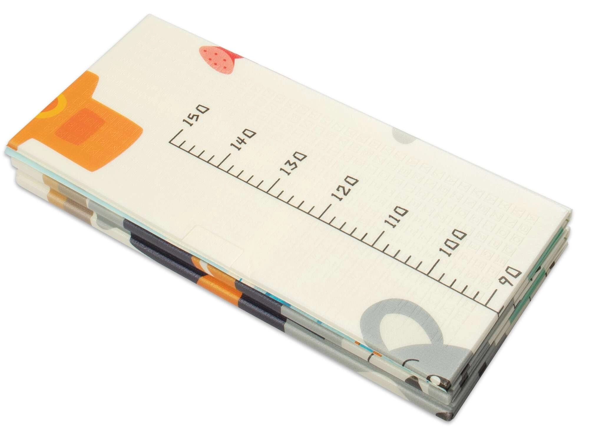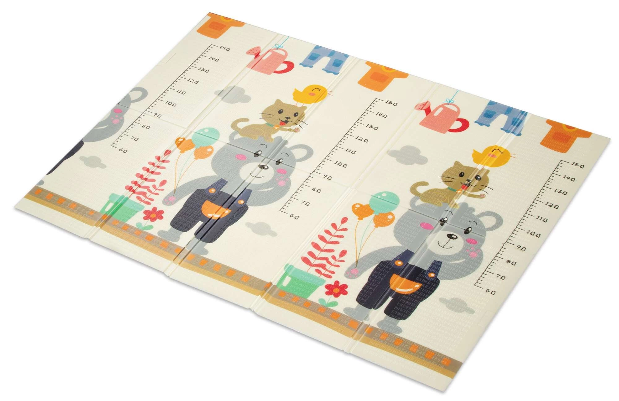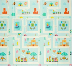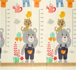 Jedna strana s roztomilými zvířátky a měřítkem pro sledování růstu, druhá s ulicemi a autíčky pro rozvoj fantazie při hře.