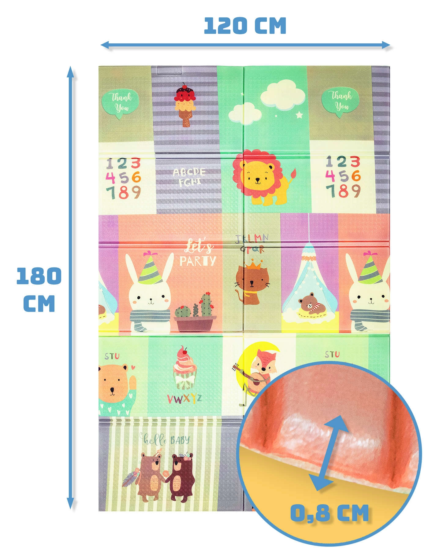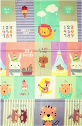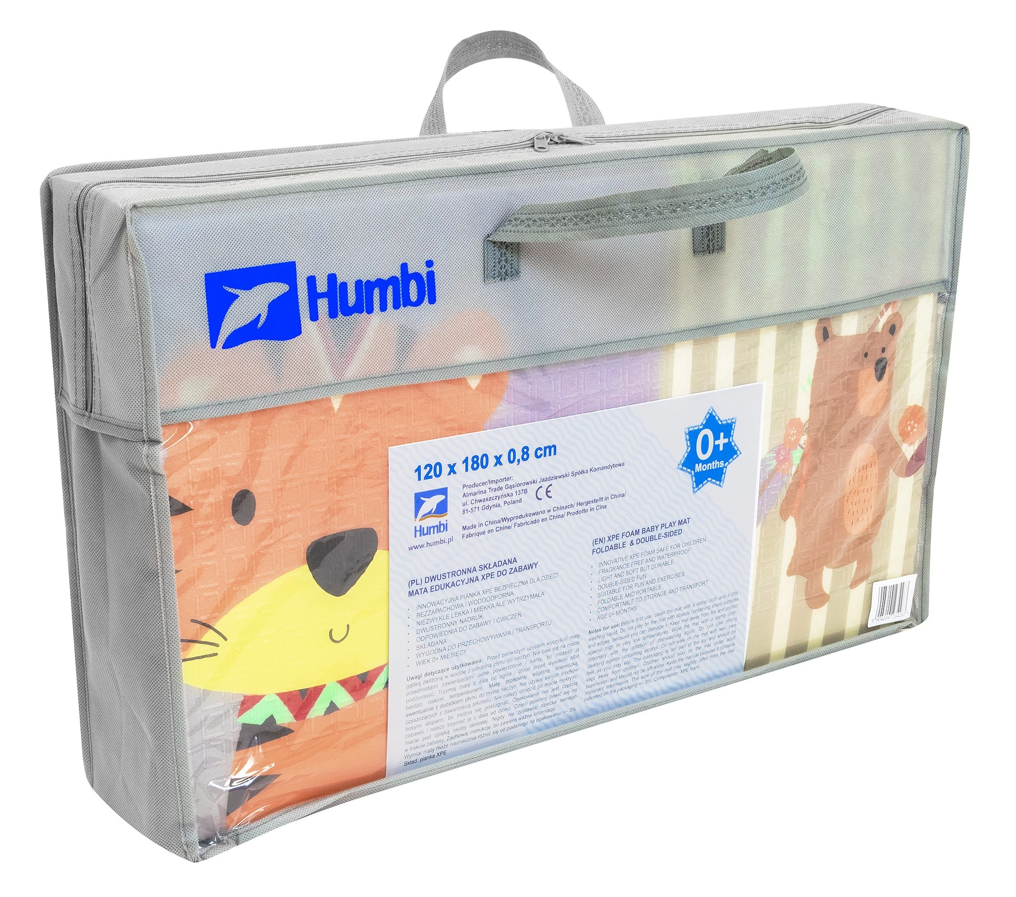 Podložka je lehká, rychle složitelná a díky přiložené tašce se zipem ji snadno vezmete na cesty, piknik či na balkon. Materiál XPE je bez zápachu, netoxický, voděodolný a jednoduchý na údržbu – stačí setřít vlhkým hadříkem. Protiskluzová struktura s jemným reliéfem podporuje bezpečné lezení a chůzi a stimuluje sensorický rozvoj.