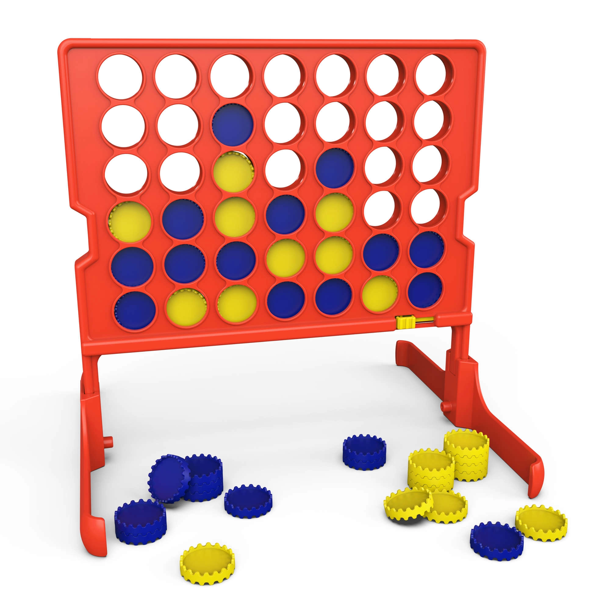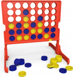 Vertikální herní plán (červený), 2 stojné nožky, 42 žetonů (žluté a modré), návod