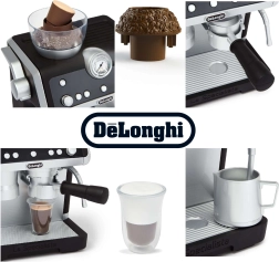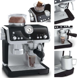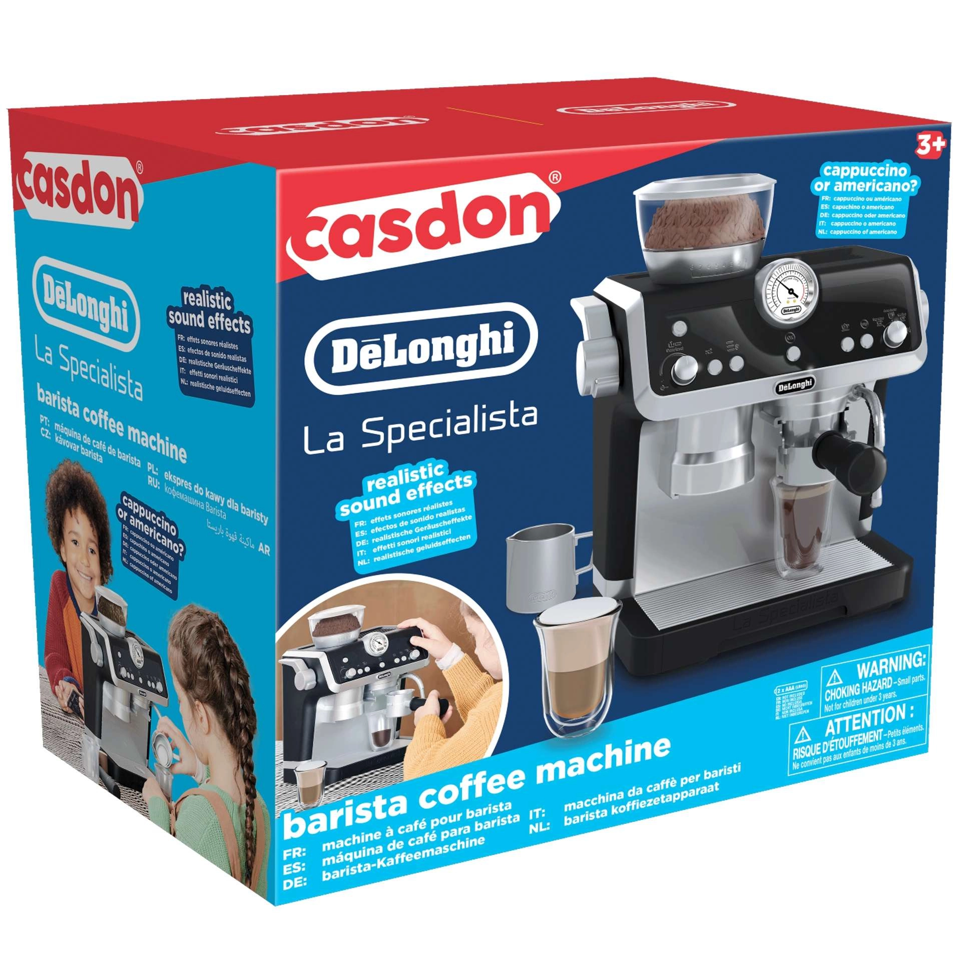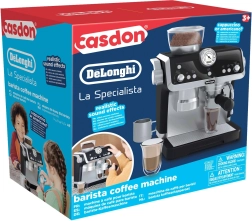 Tento moderní dětský kávovar v elegantní černo‑bílé kombinaci věrně napodobuje skutečný pákový espresso stroj. Děti mohou „namlít“ zrna v horním zásobníku, zacvaknout páku (portafilter), stisknout tlačítka a sledovat, jak „káva“ teče do sklenic. Pro milovníky cappuccina nechybí parní tryska s realistickými zvuky pro spěnění „mléka“.
