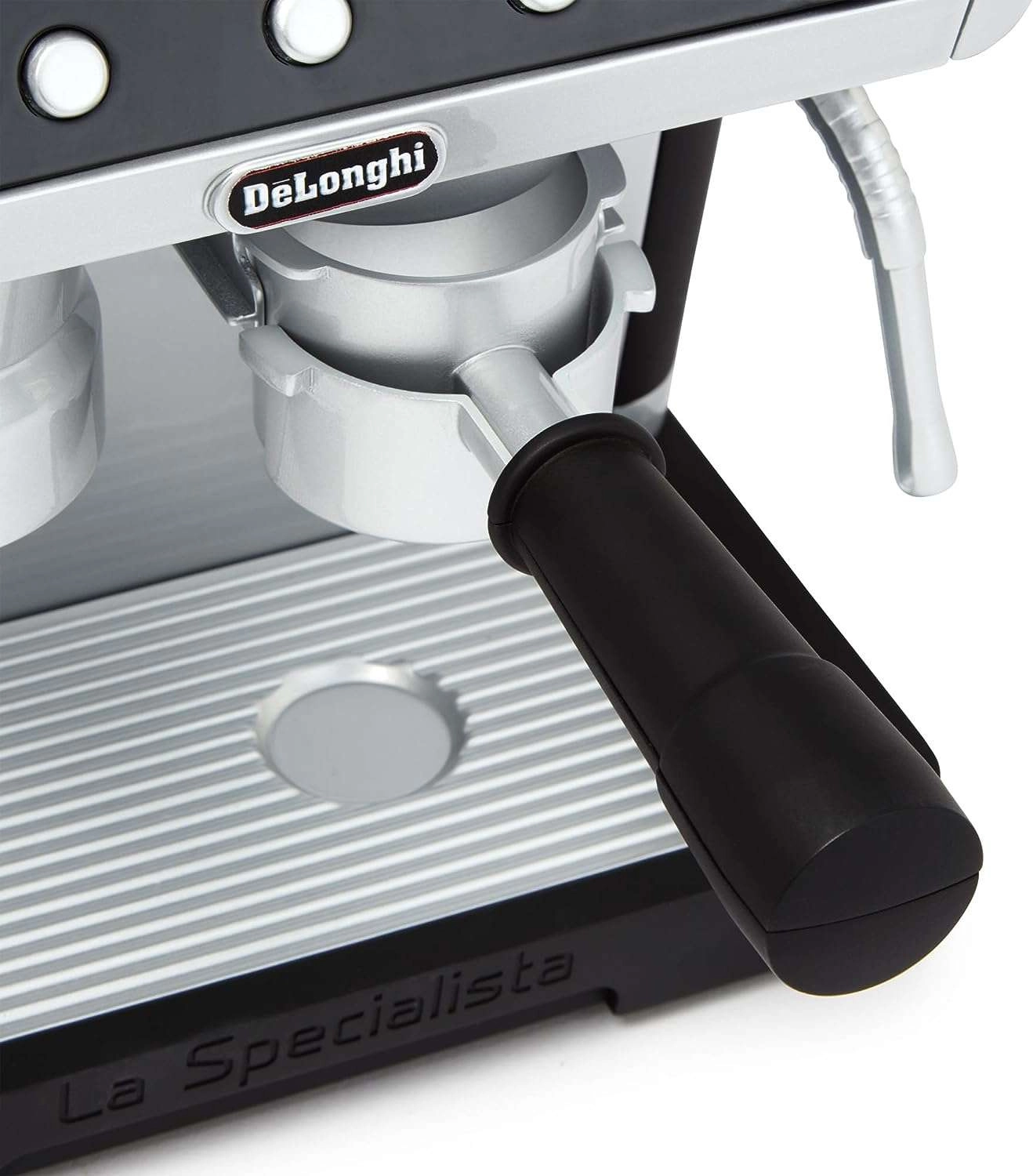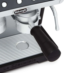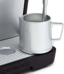 Horní zásobník na „zrna“, pohyblivá páka a tlačítka napodobují skutečný postup přípravy kávy – včetně zvuků mletí a protékání.