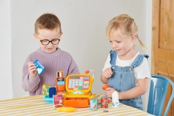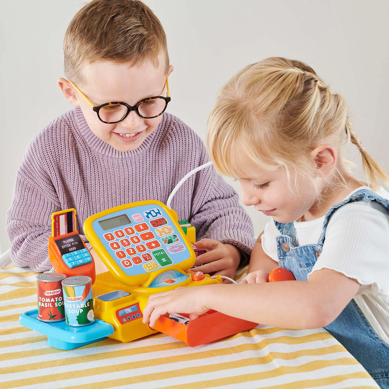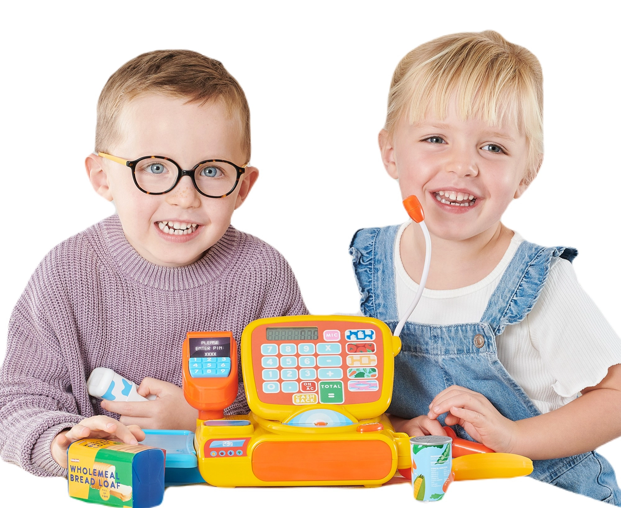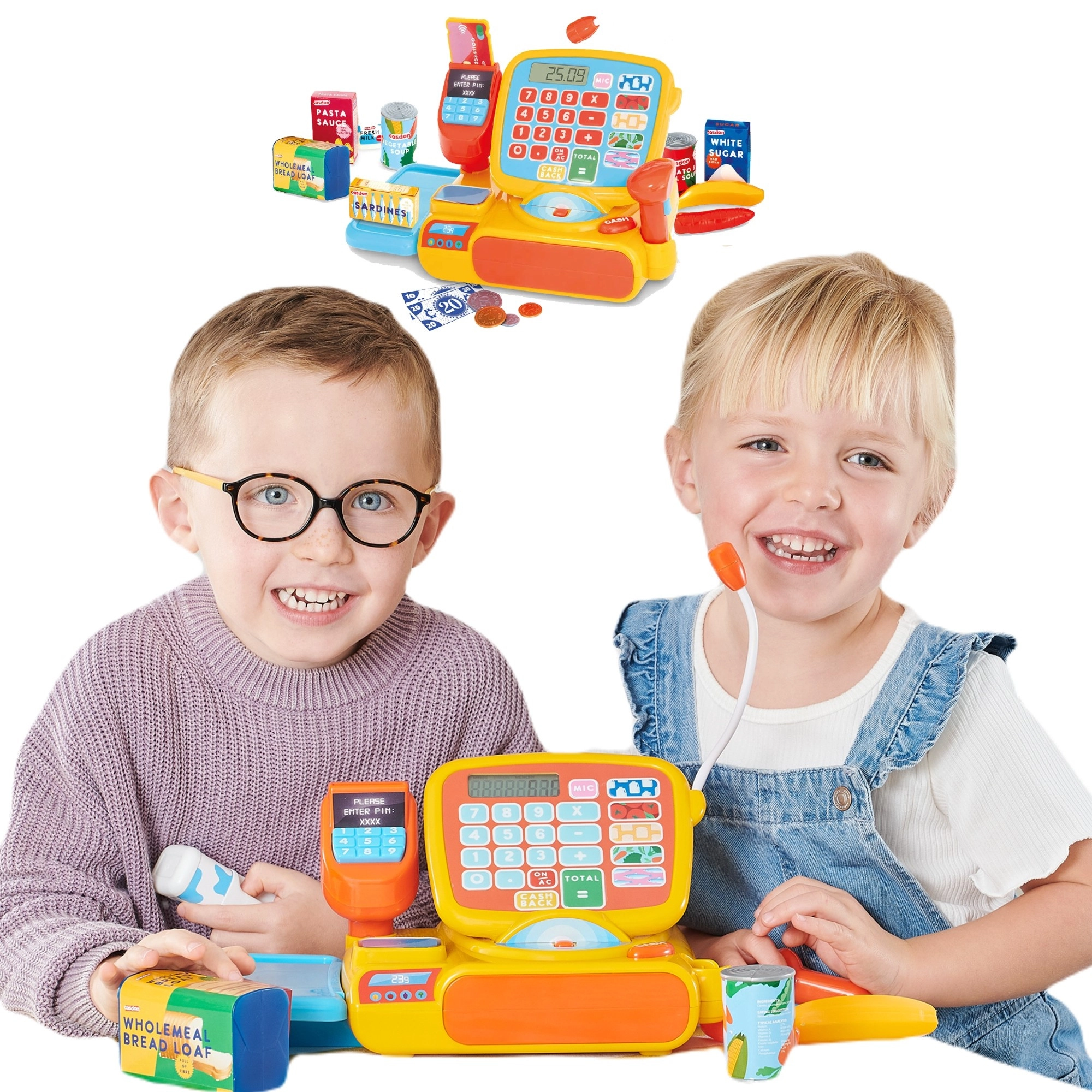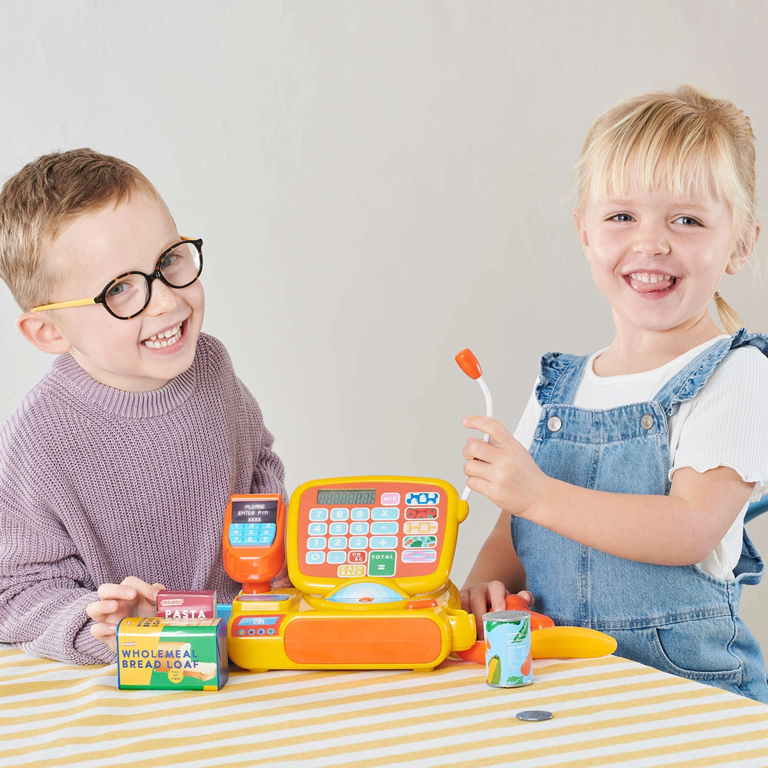 Objevte zábavnou hru na pokladní s dětskou pokladnou CASDON v energických barvách. Děti mohou skenovat zboží, sčítat nákupy na kalkulačce s čitelnou klávesnicí, platit kartou nebo hotovostí a komunikovat přes funkční mikrofon. Realistické zvukové efekty při skenování a vložení karty podpoří představivost i učení čísel a základů finanční gramotnosti.