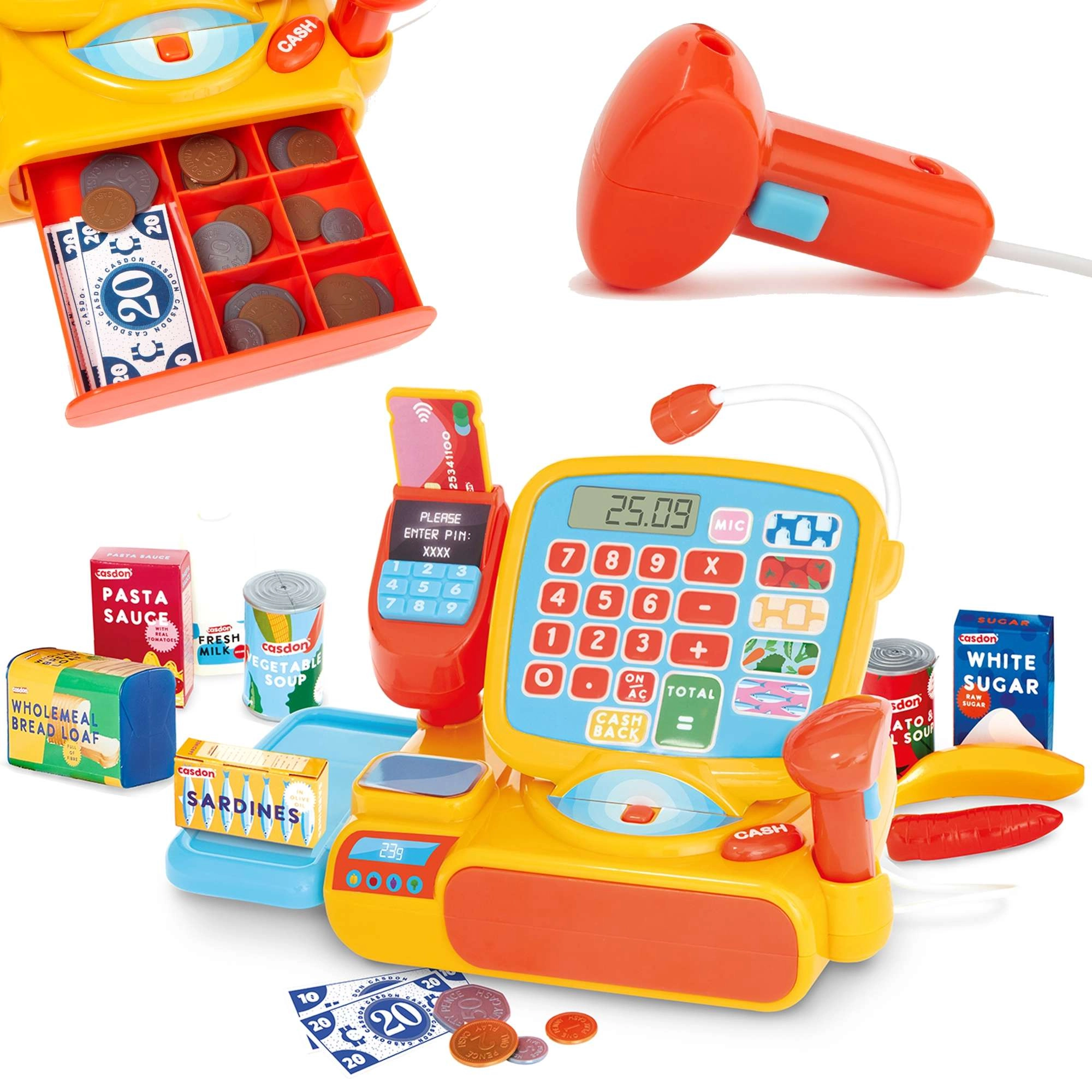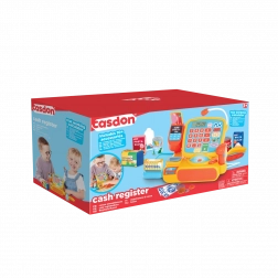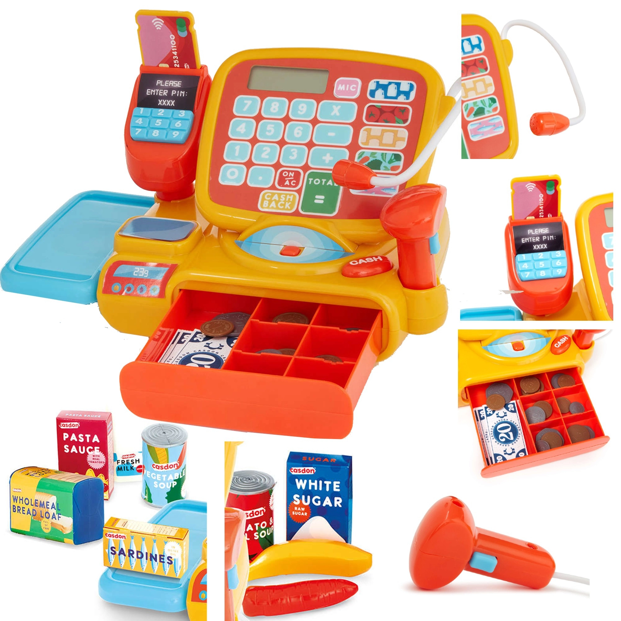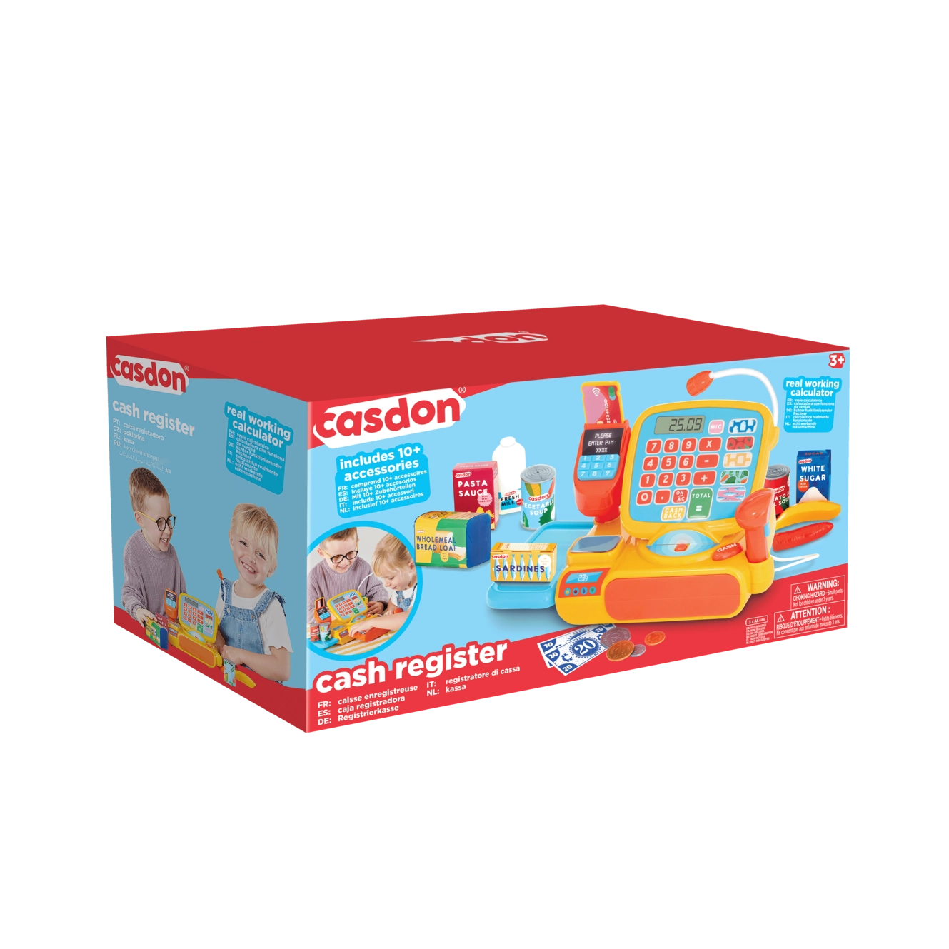 Barevná dětská pokladna CASDON nabízí realistickou hru na obchod s bohatým příslušenstvím. Má funkční displej s kalkulačkou, skener čárových kódů, čtečku karet, váhu a výsuvnou zásuvku na peníze. Součástí jsou bankovky, mince, platební karta a makety potravin. Nechybí zvukové efekty a mikrofon pro ještě realističtější zážitek.