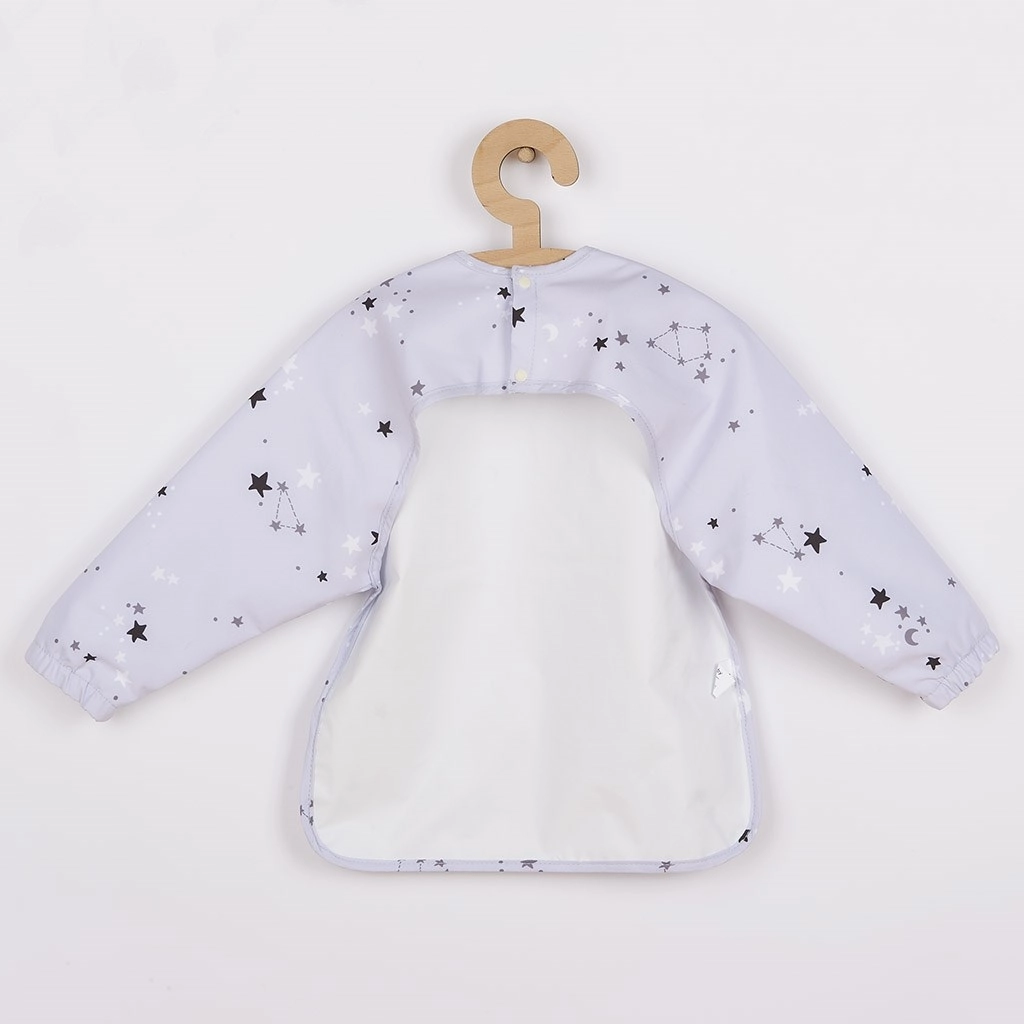 Praktický dětský bryndák–zástěra s dlouhým rukávem New Baby spolehlivě chrání oblečení při jídle i tvoření. Je z lehkého, měkkého materiálu, má pohodlné zapínání na 2 cvočky a praktickou kapsu. Spodní vrstva je nepromokavá, takže stačí setřít vlhkým hadříkem nebo vyprat v pračce. Díky dlouhým rukávům je ideální i na malování a kreativní hry.