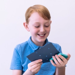 V balení najdete děrovač, 99 kostiček, 2 šablony a 6 karet. Stačí děrovat, vyplnit otvory kostičkami a vytvořit vlastní design.