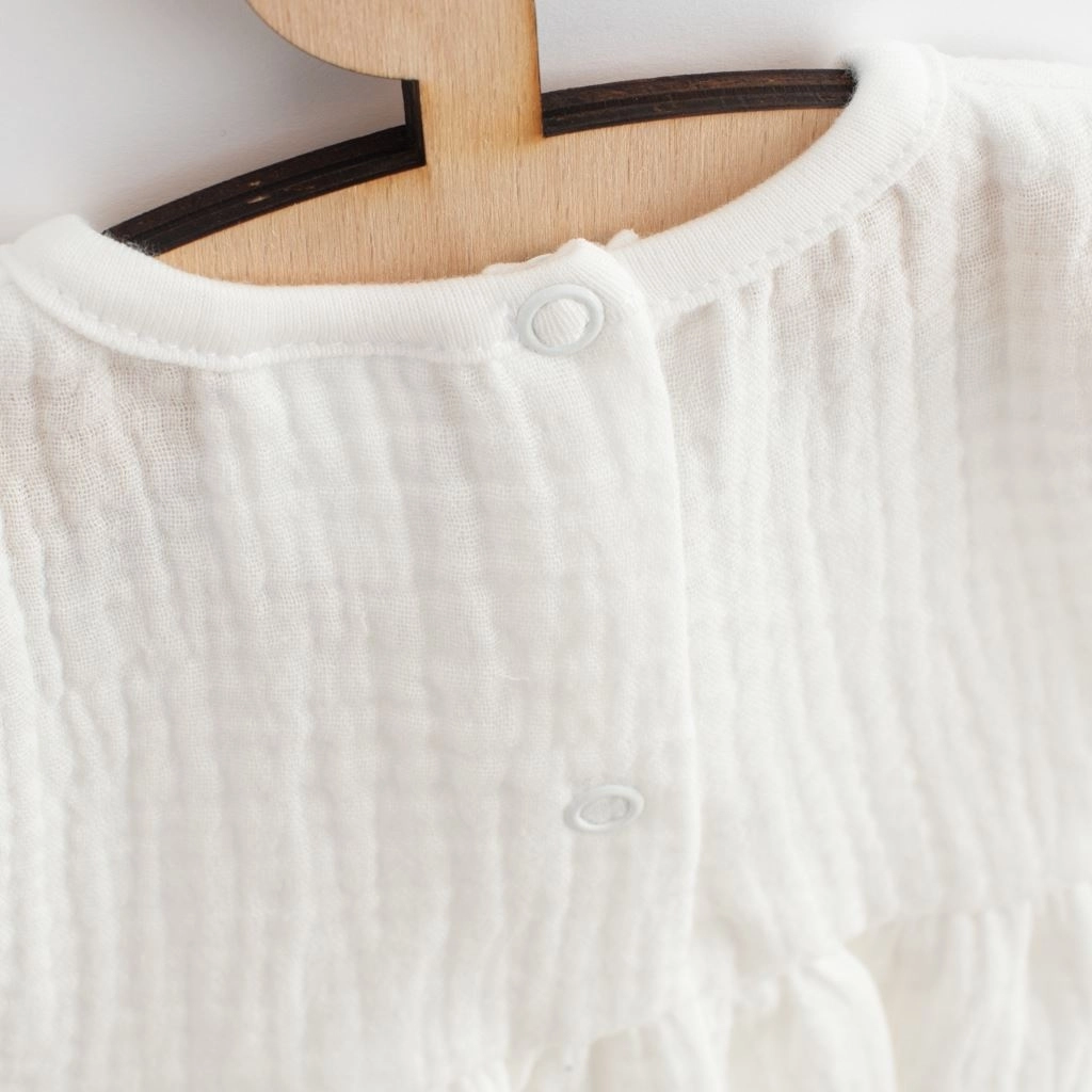 Šaty mají praktické zapínání na patentek na zádech, které usnadňuje převlékání i rodičům. Mušelín navíc s každým praním měkne a zůstává odolný, takže si šaty dlouho udrží krásný vzhled.