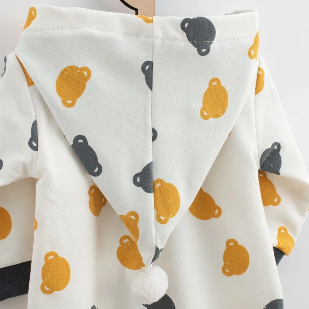 Tento stylový teplákový overal NEW BABY Little One potěší rodiče i děti. Praktický zip po celé délce usnadní převlékání, zatímco kapuce s barevnou podšívkou a roztomilým bambulkou dodá šmrnc. Celoplošný potisk medvídků si zamilujete na první pohled.