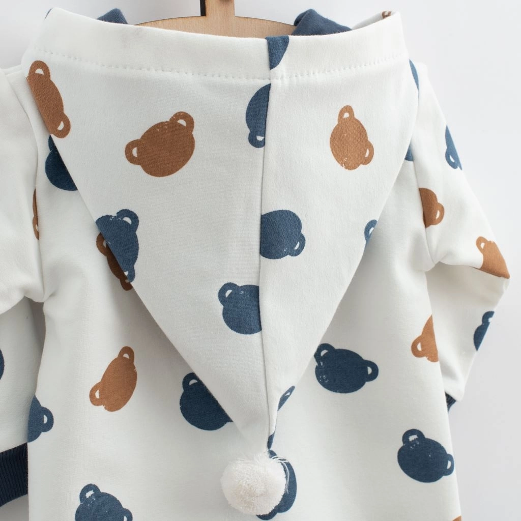 Overal je celopotištěný medvídky a doplněn pružnými lemy na rukávech a nohavicích, které drží tvar a chrání před chladem. Skvělá volba pro doma, na procházky i do kočárku – univerzální kousek na celý rok.