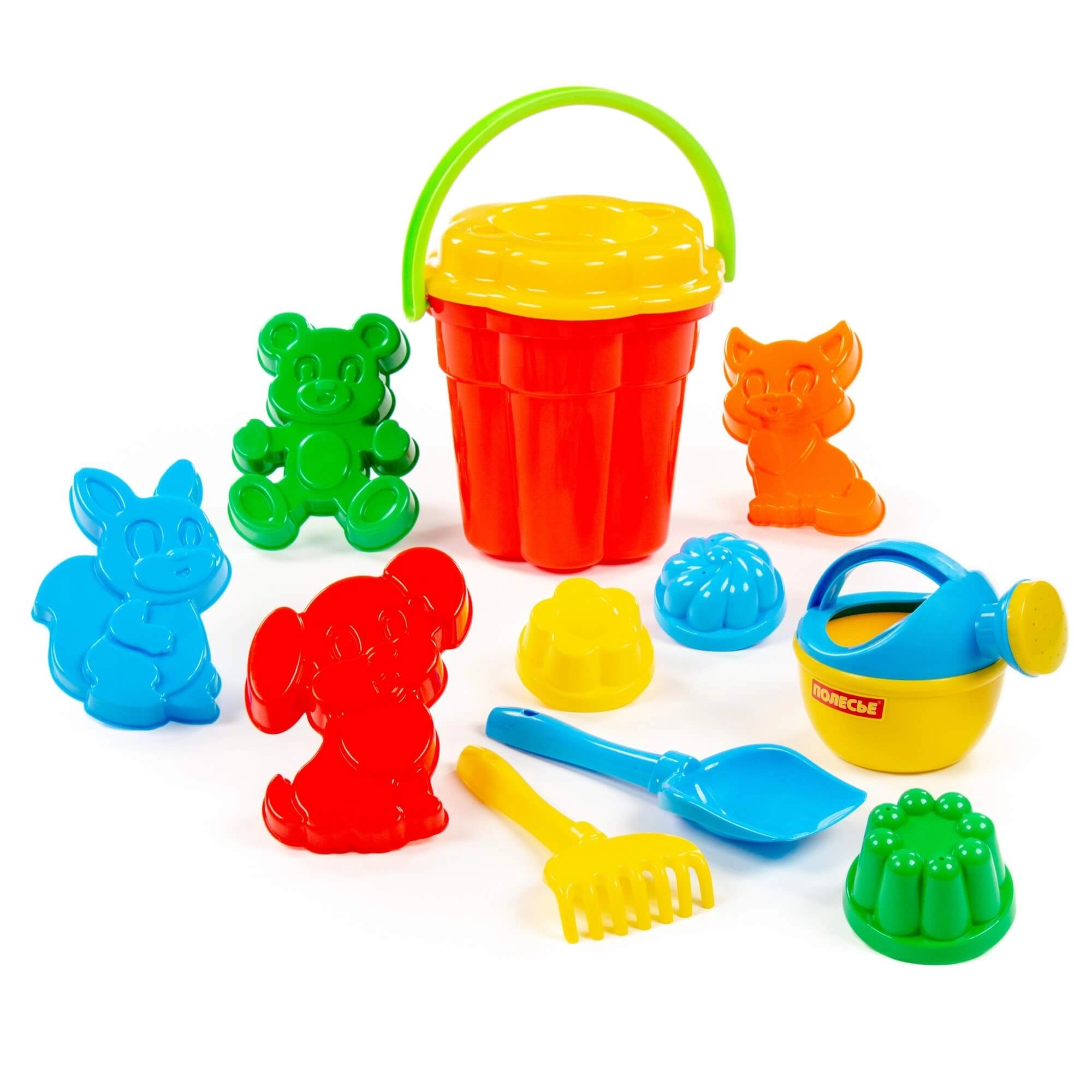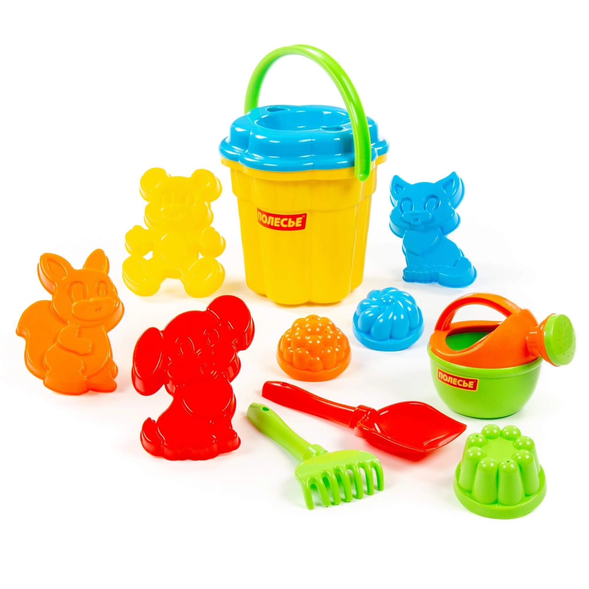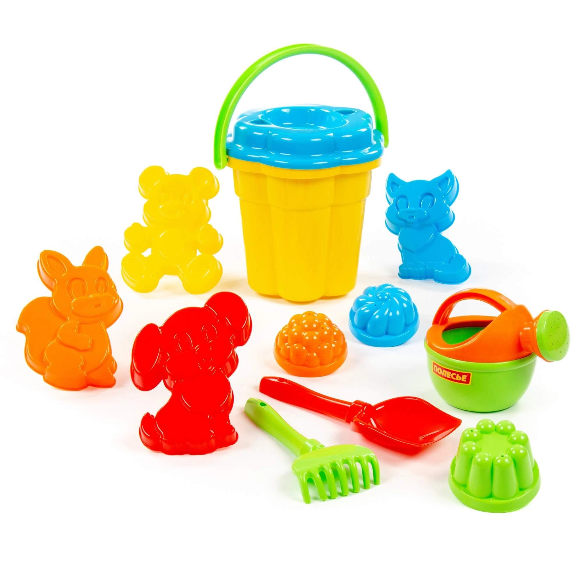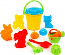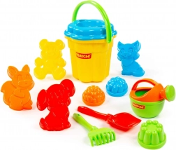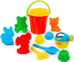- Vědro, 4× formička zvířátka, 3× formička bábovička, lopatka, hrabičky, konev