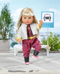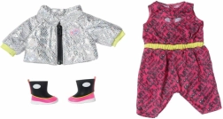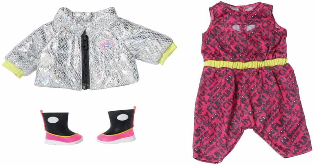 Růžový overal s výjimečným potiskem a stříbrná bundička s neon manžetami dělají každou panenku BABY born nepřehlédnutelnou.