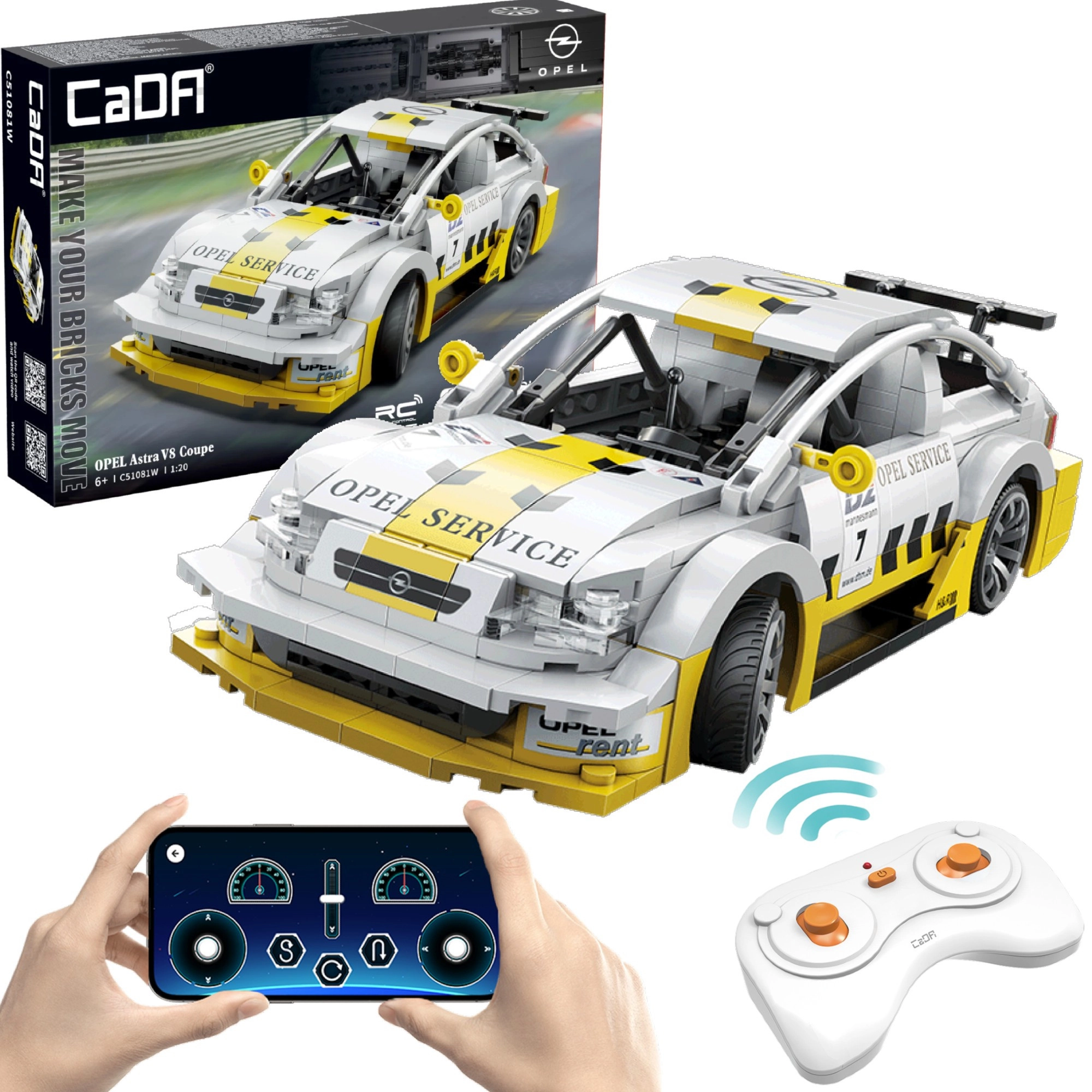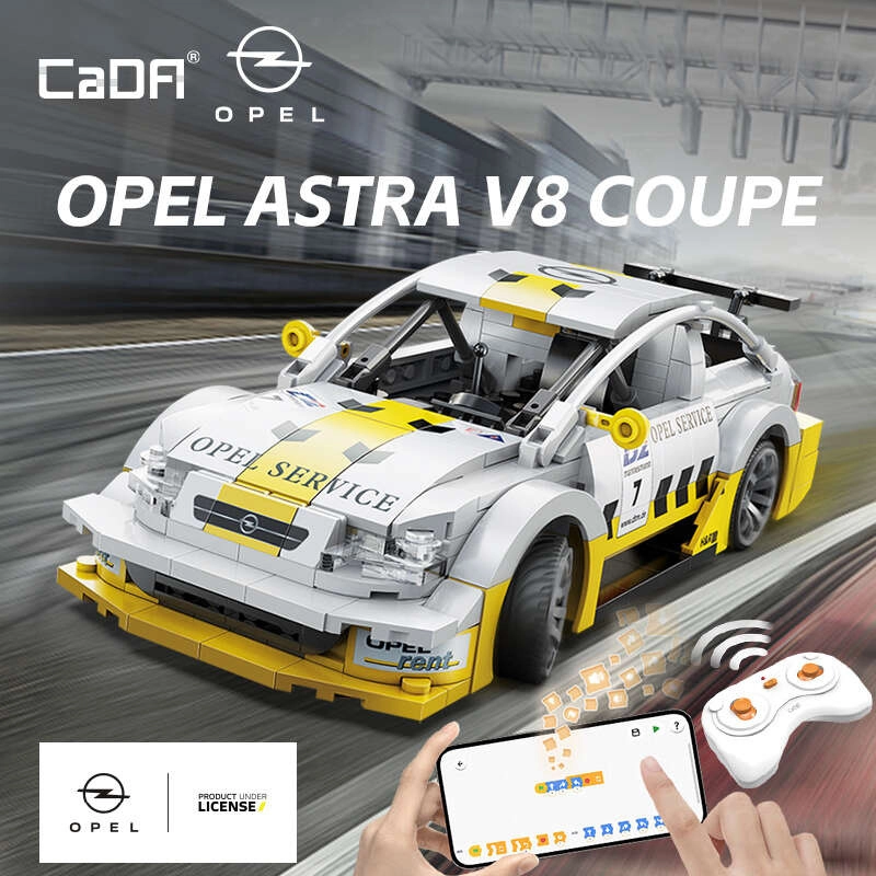 Užijte si stavění i jízdu s detailním modelem OPEL Astra V8 Coupe v měřítku 1:20. Model v elegantní bílo‑žluté kombinaci s realistickými polepy potěší sběratele i děti. Díky Dual Mode ovládání přepnete mezi dálkovým ovladačem 2,4 GHz a mobilní aplikací přes Bluetooth – snadno, rychle a zábavně.