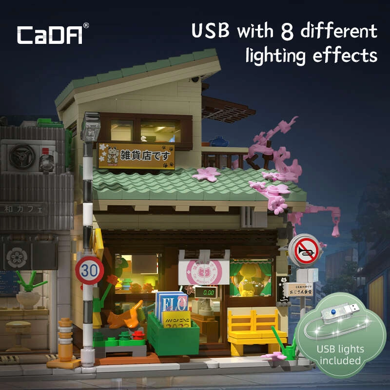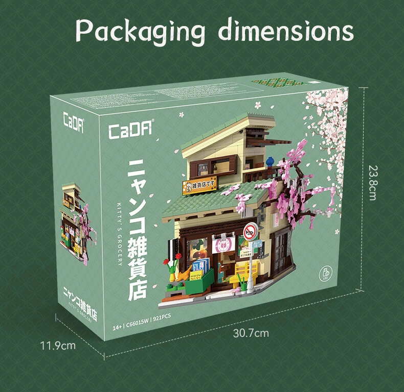 Objevte kouzlo japonské architektury se stavebnicí CaDA, která z 921 dílků vytváří detailní modulární obchod s možností nahlédnutí do interiéru. Nechybí LED osvětlení s 8 efekty, pohyblivé prvky (posuvné dveře, výsuvná markýza, otevírací okno) a bohaté dekorace včetně sakury, stavu s koi, značek a figurky maneki-neko.