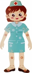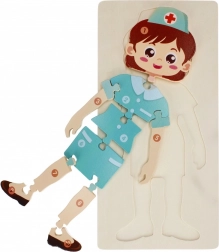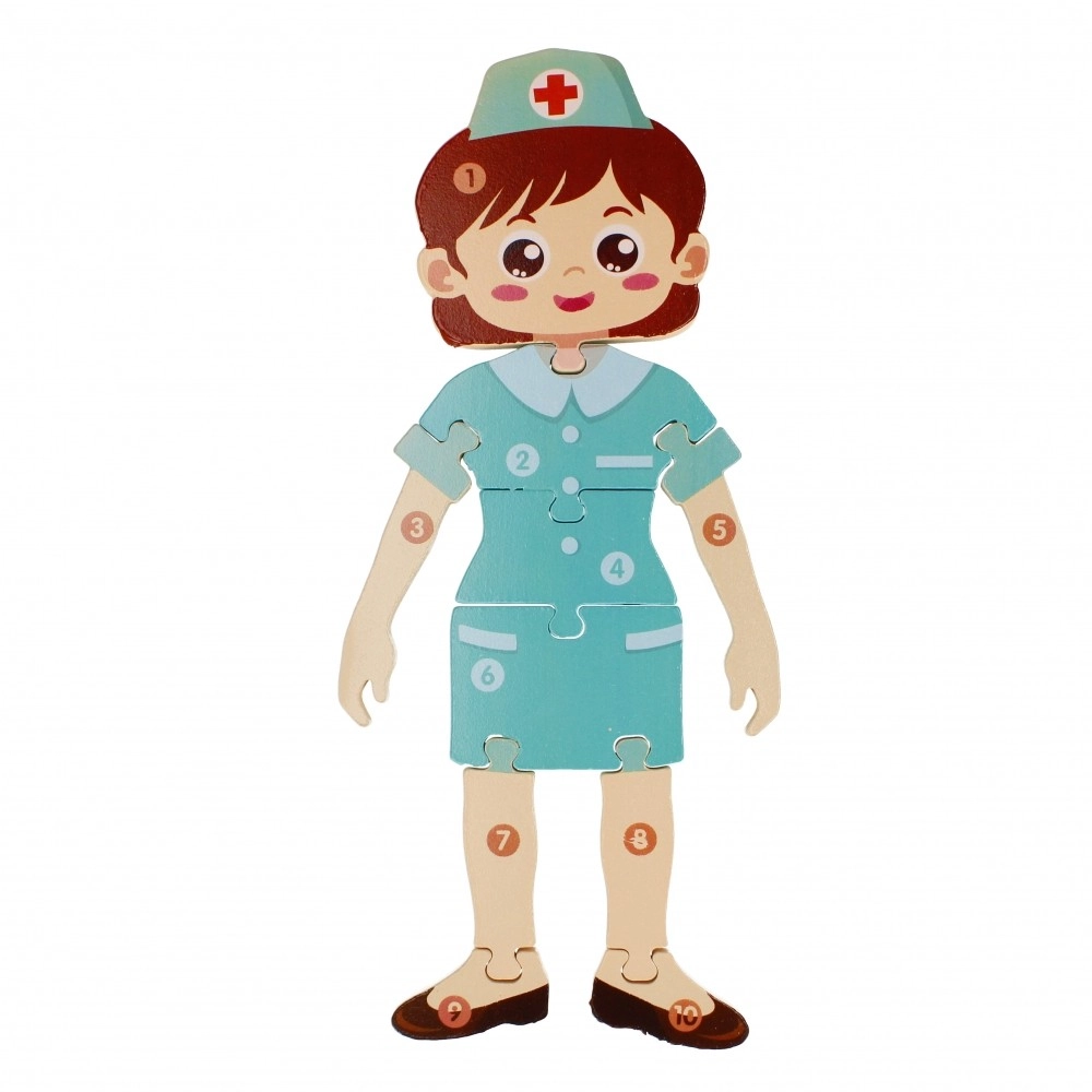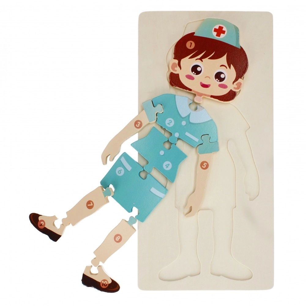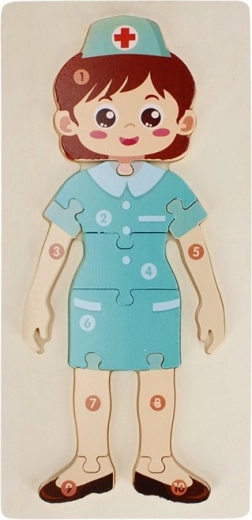 Dřevěné puzzle Sestřička je ideální vzdělávací hračka pro předškolní děti. Dílky ve tvaru postavičky zdravotní sestřičky pomáhají rozvíjet jemnou motoriku, koordinaci oko–ruka a logické myšlení. Díky příjemnému dřevěnému materiálu a zaobleným hranám je skládání pohodlné a bezpečné.