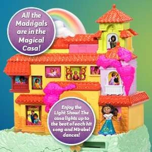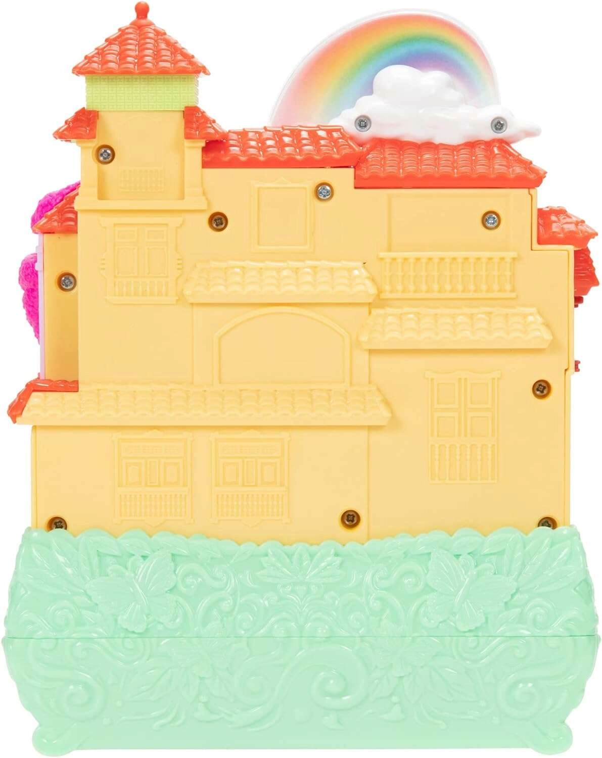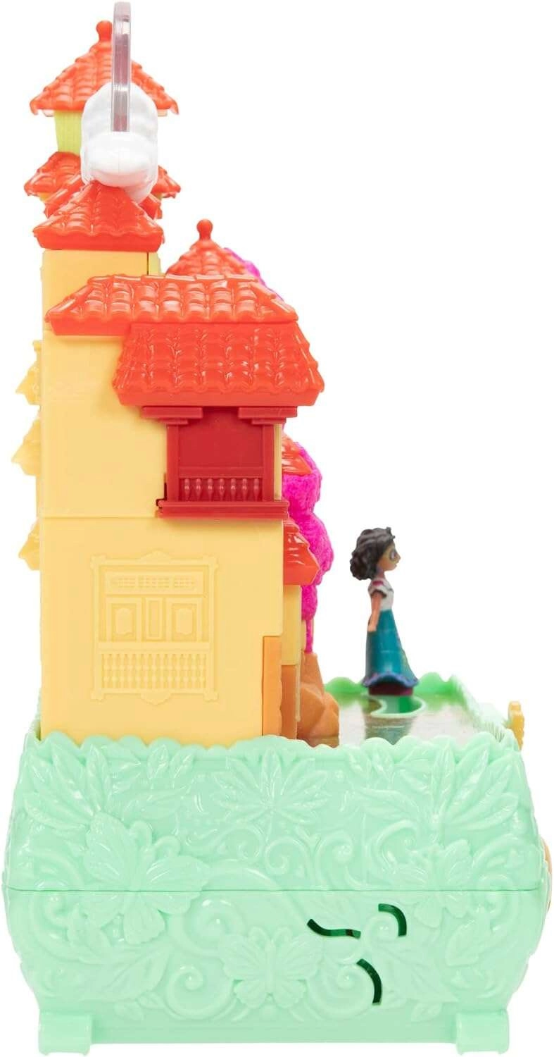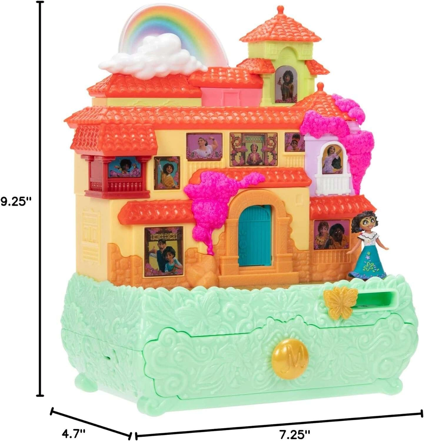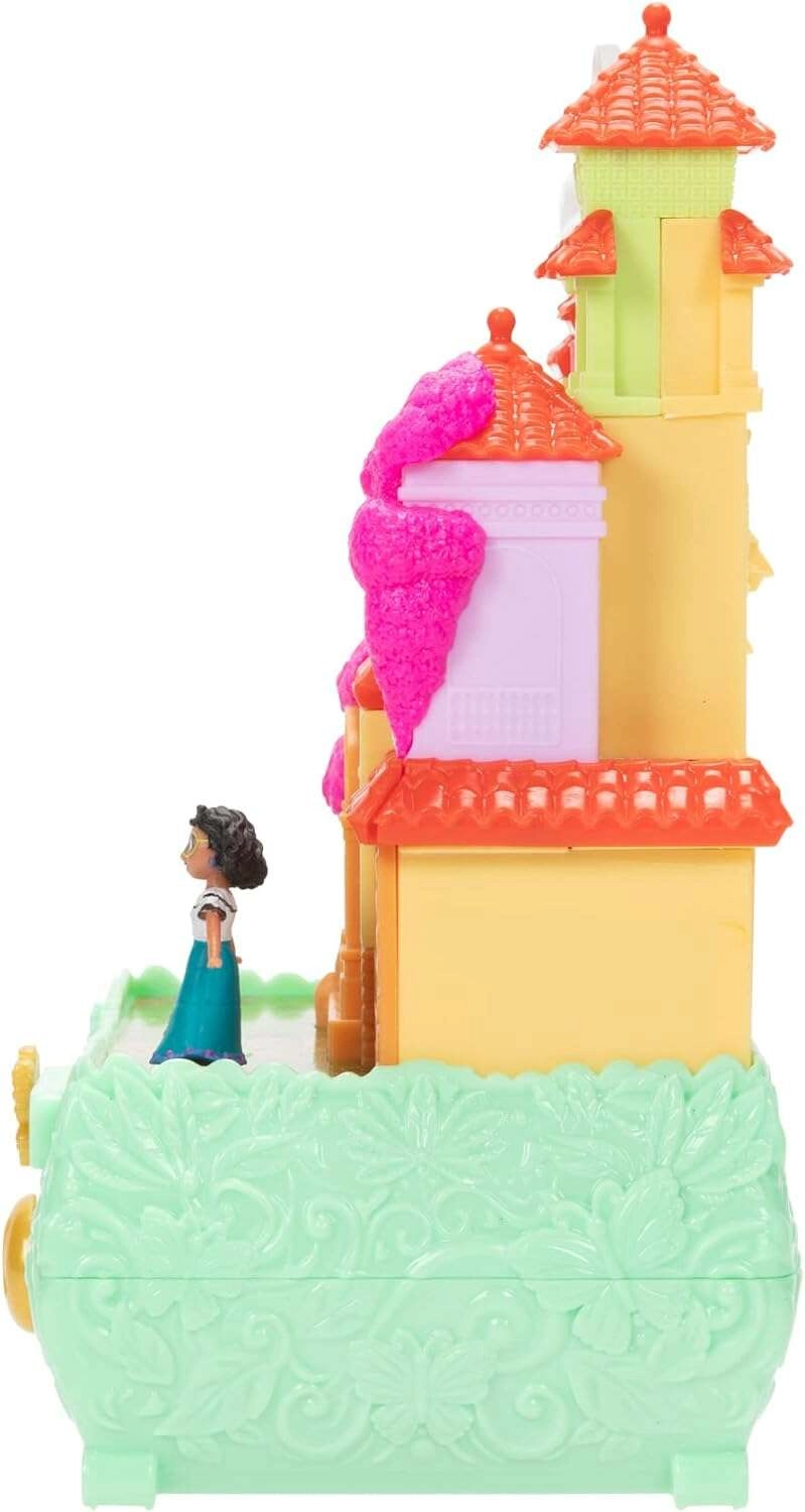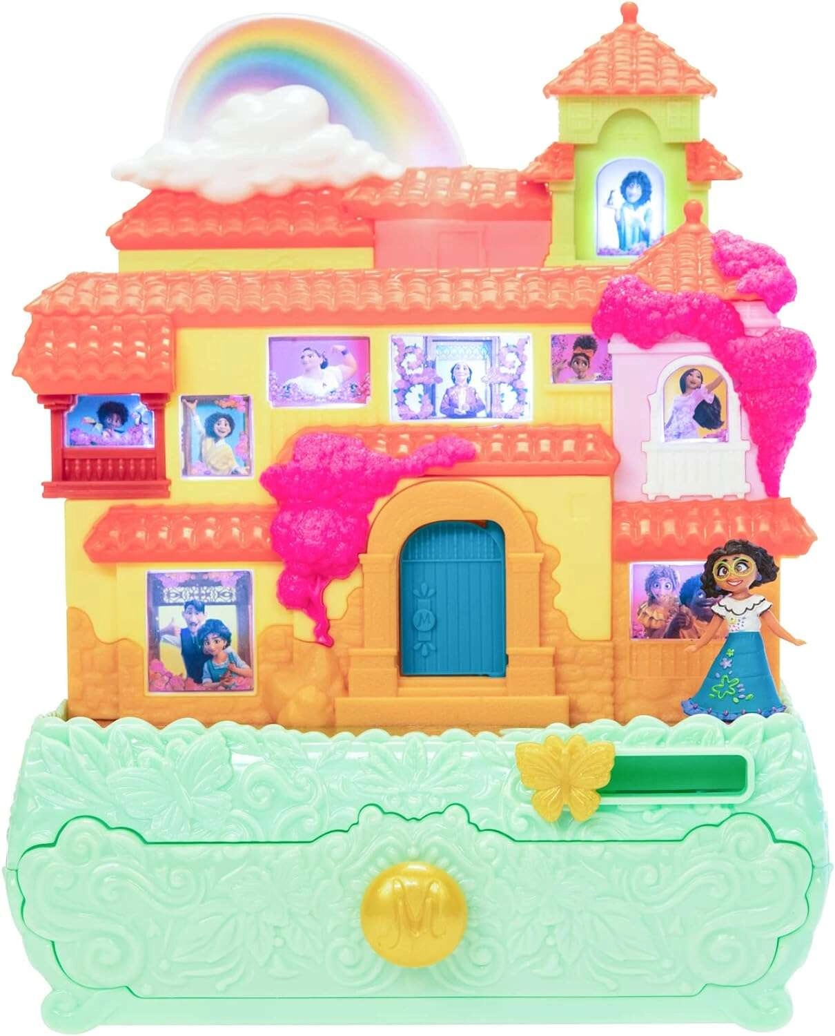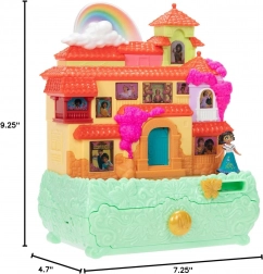 Tato barevná šperkovnice inspirovaná domem rodiny Madrigal přináší dětem kouzlo filmu ENCANTO přímo do pokoje. Po spuštění se rozsvítí okna, otevřou se dveře, Mirabel se roztančí a zazní známé melodie z filmu. Uvnitř základny je praktický šuplíček na drobnosti a šperky, součástí je i prstýnek s motýlkem.