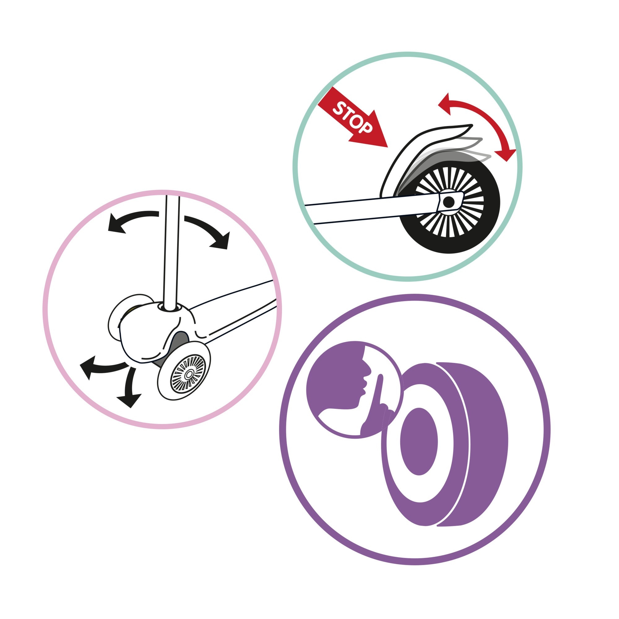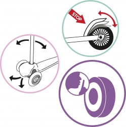 Bezpečnost je na prvním místě: zadní nožní brzda umožňuje rychlé a plynulé zastavení, zatímco tichá kolečka zajišťují hladký provoz bez zbytečného hluku. Koloběžka je skvělá pro rozvoj motoriky, koordinace a sebejistoty dětí.