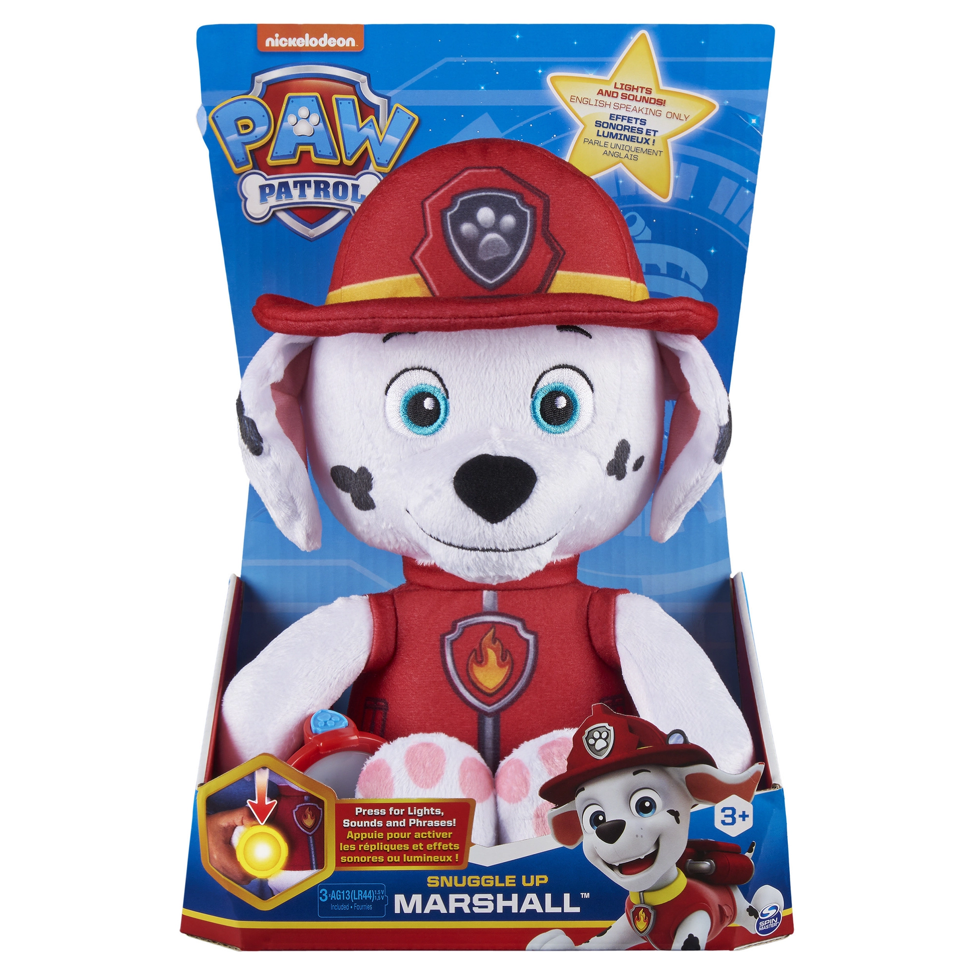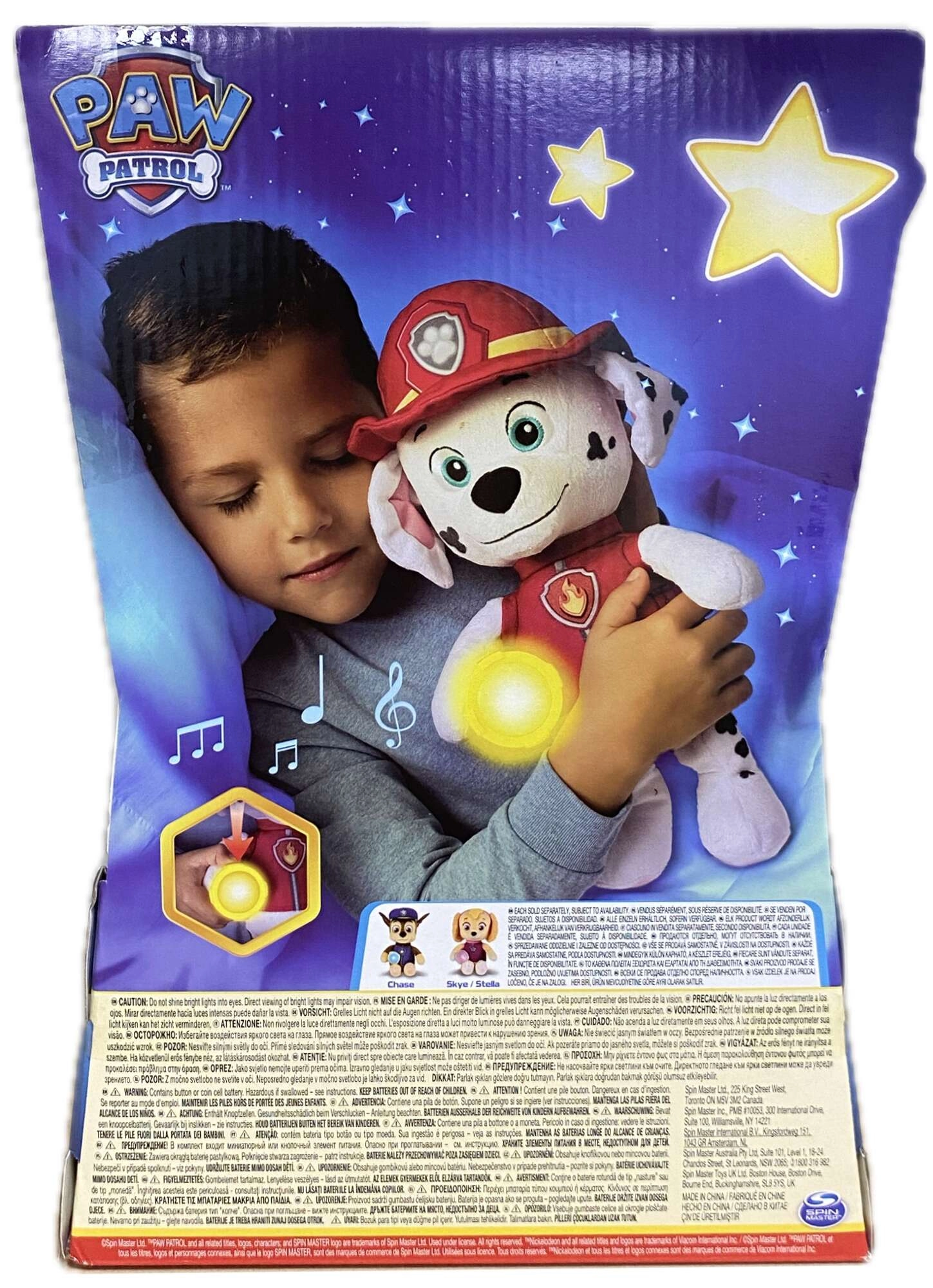 Po stisknutí tlačítka na horní straně baterky se rozsvítí příjemné světlo, zazní tři uklidňující melodie a na závěr Marshall popřeje dobrou noc v angličtině. Hračka je vyrobena z měkkého plyše s kvalitními vyšívanými detaily pro bezpečné a pohodlné mazlení.