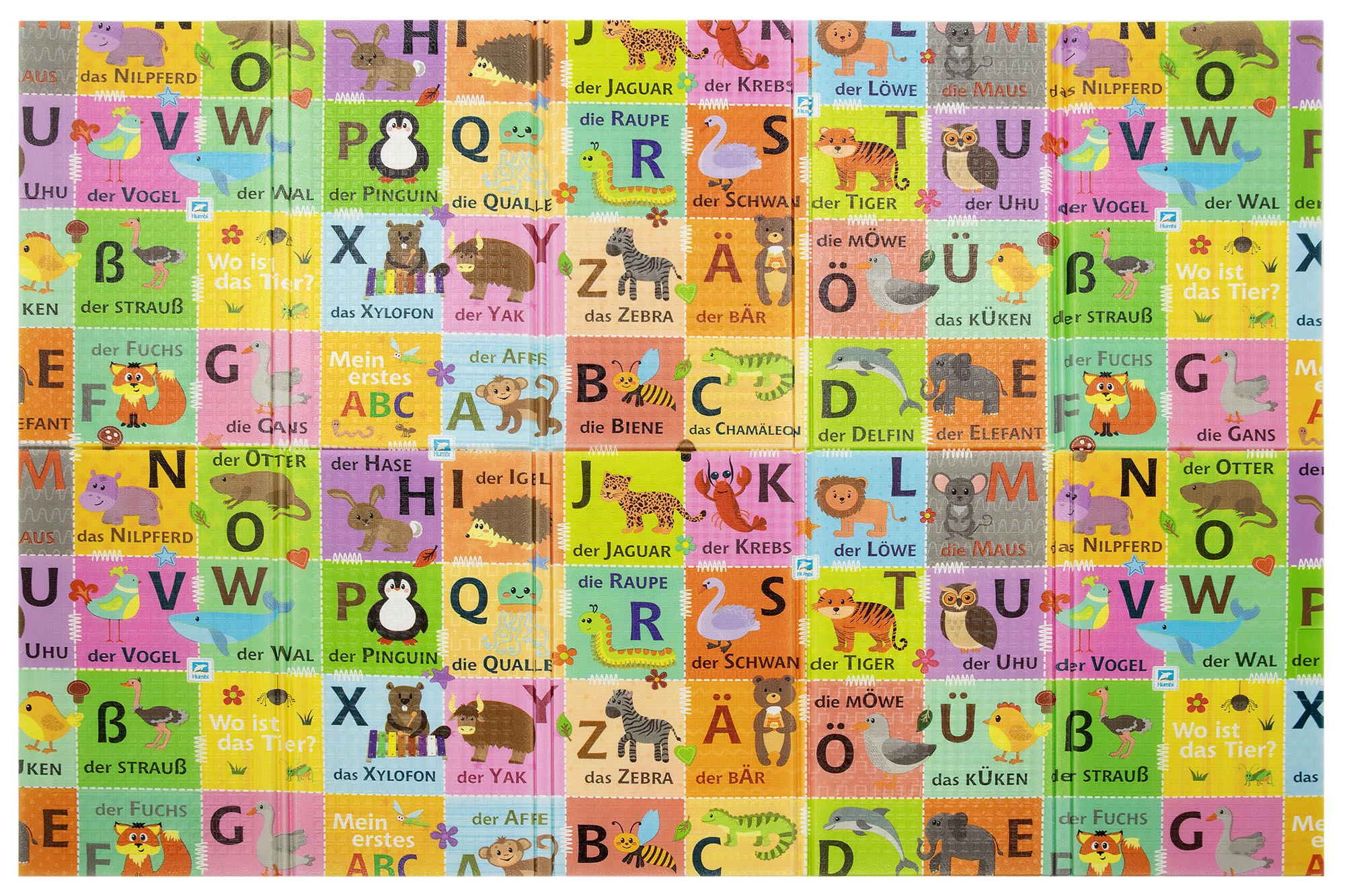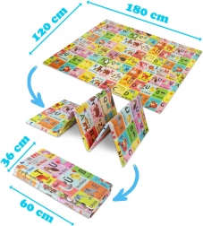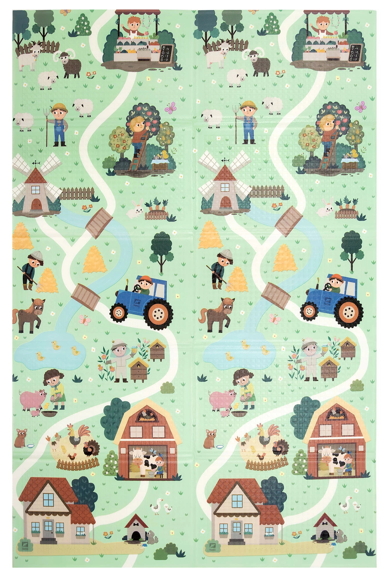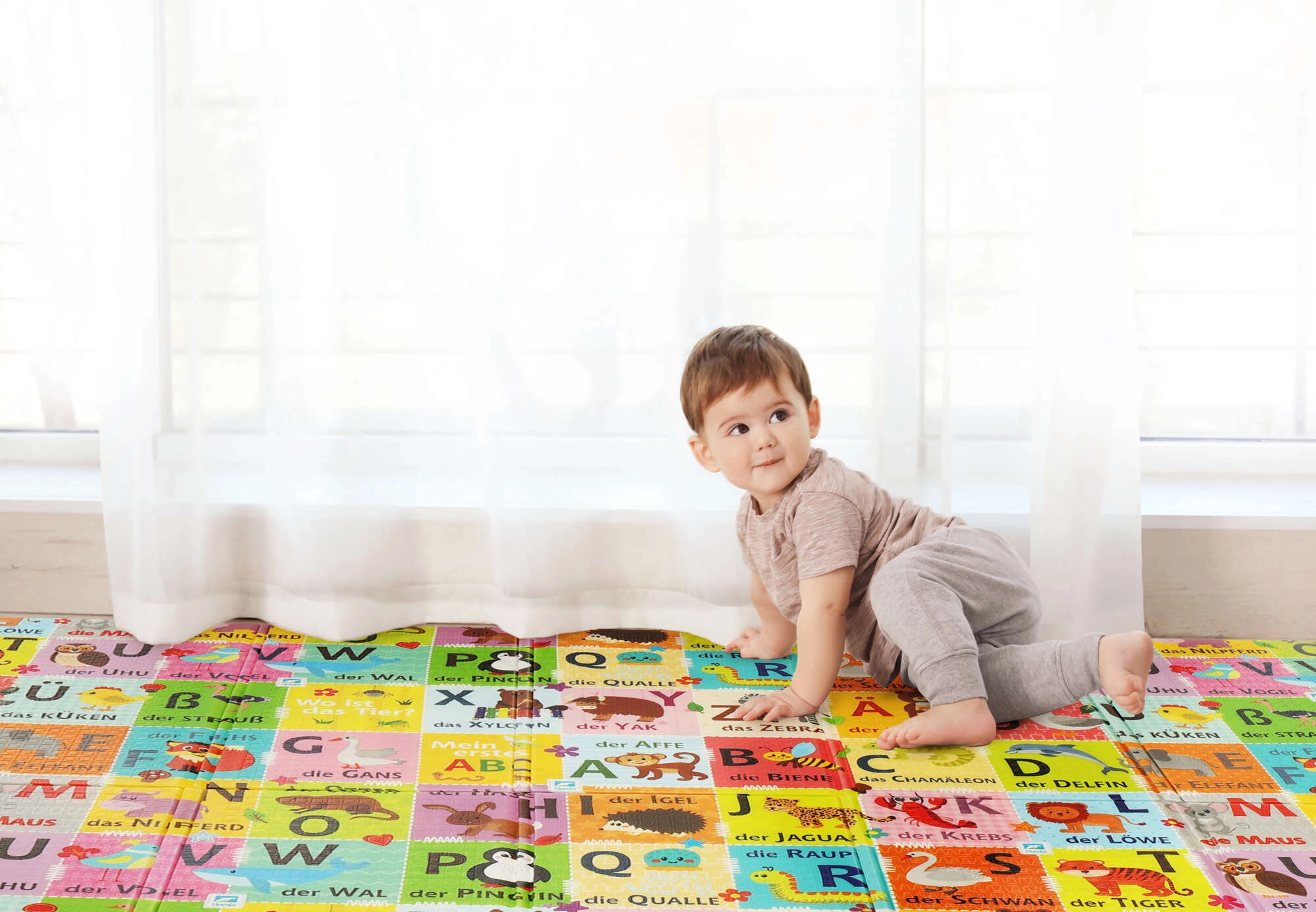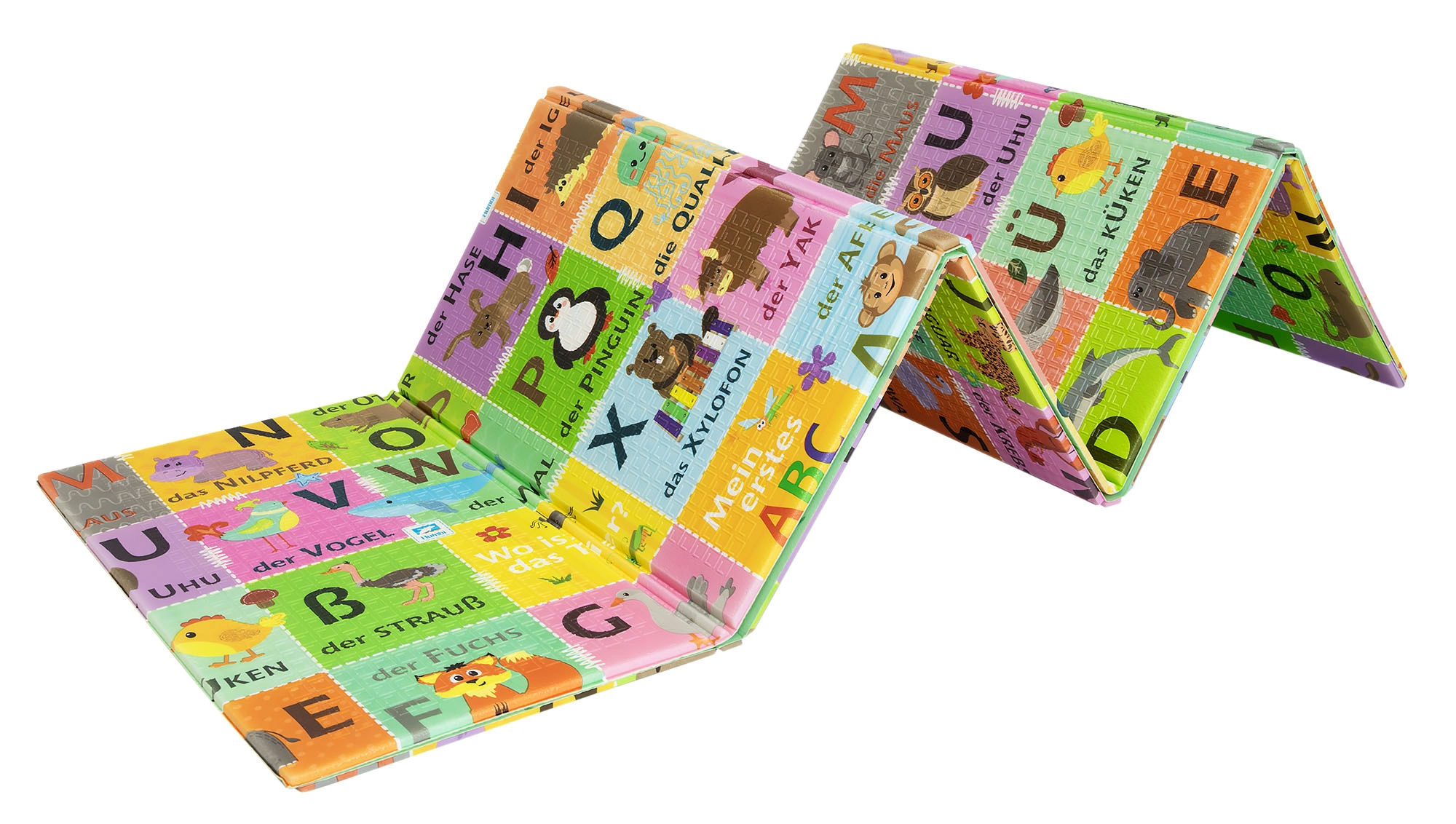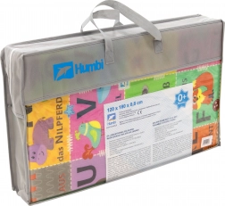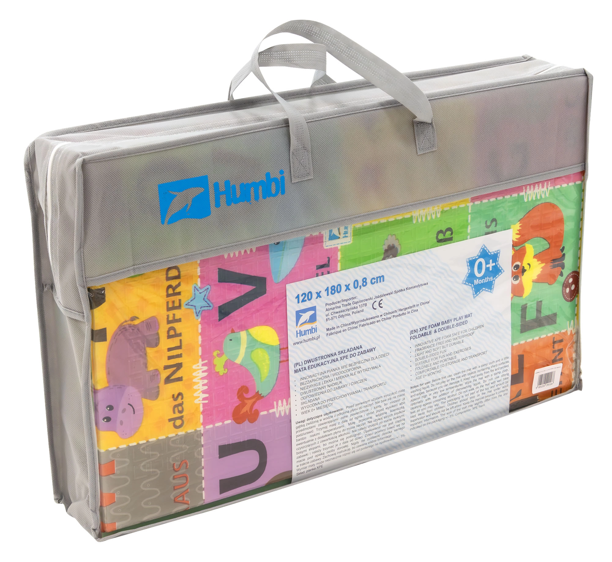 Podložka HUMBI z kvalitní bezvonné pěny XPE je odolná, pružná a příjemně měkká. Dvouvrstvé provedení přináší dvě vzdělávací grafiky – německou abecedu s obrázky a motiv života na farmě pro rozvoj fantazie. Díky rozměrům 120 × 180 × 0,8 cm nabízí dostatek prostoru pro hraní, lezení i první krůčky.