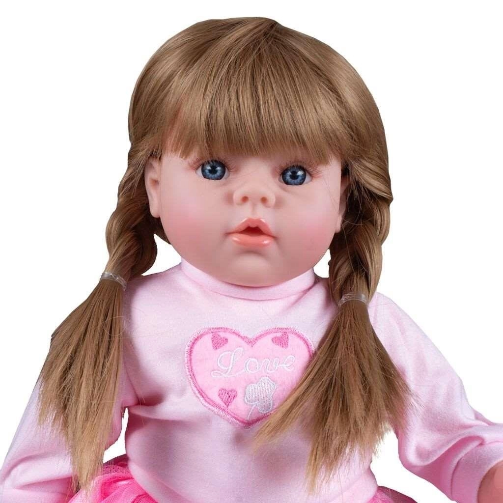 Panenka PlayTo Tina o délce 46 cm je skvělým společníkem pro hry na maminku a tatínka. Realistické detaily obličeje, zapletené hnědé vlásky a jemné oblečky v růžových tónech podněcují k něžnému hraní a péči. Díky měkkému tělíčku je panenka příjemná na mazlení, zatímco gumové končetiny a hlava zajišťují odolnost při každodenním používání.