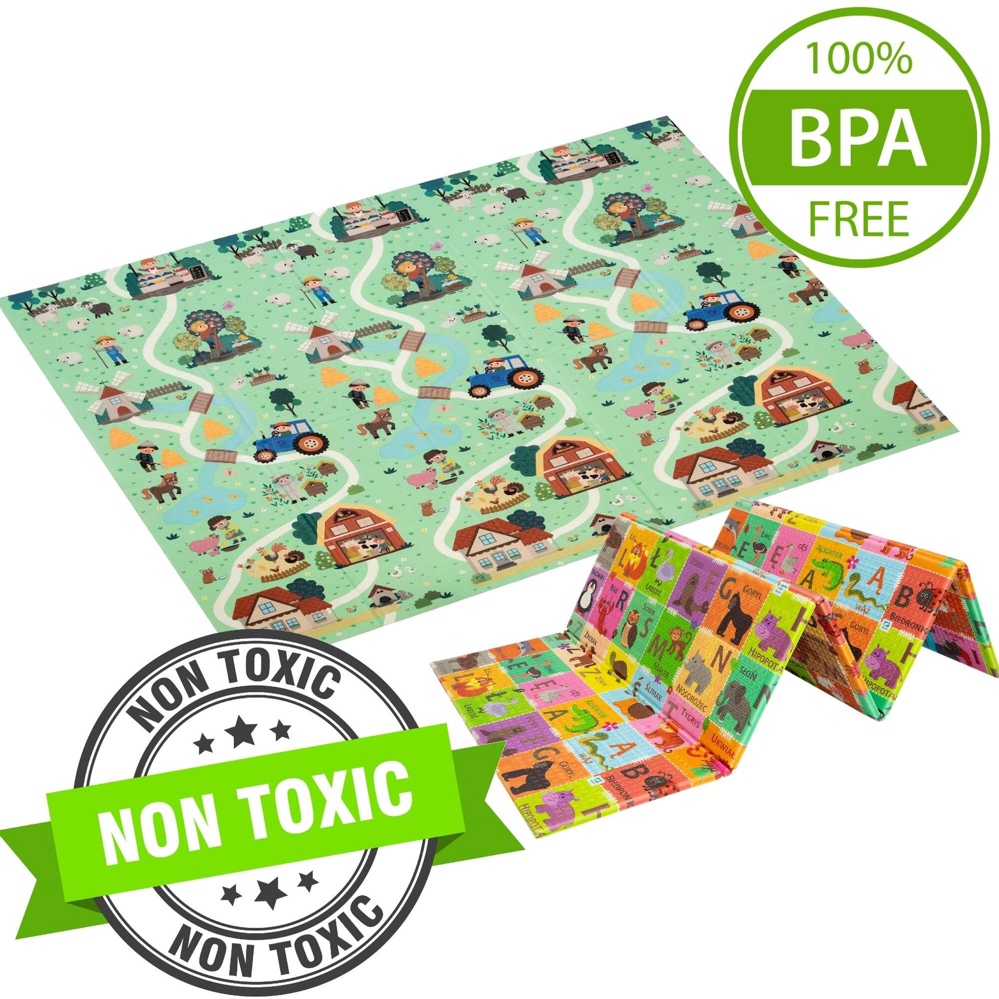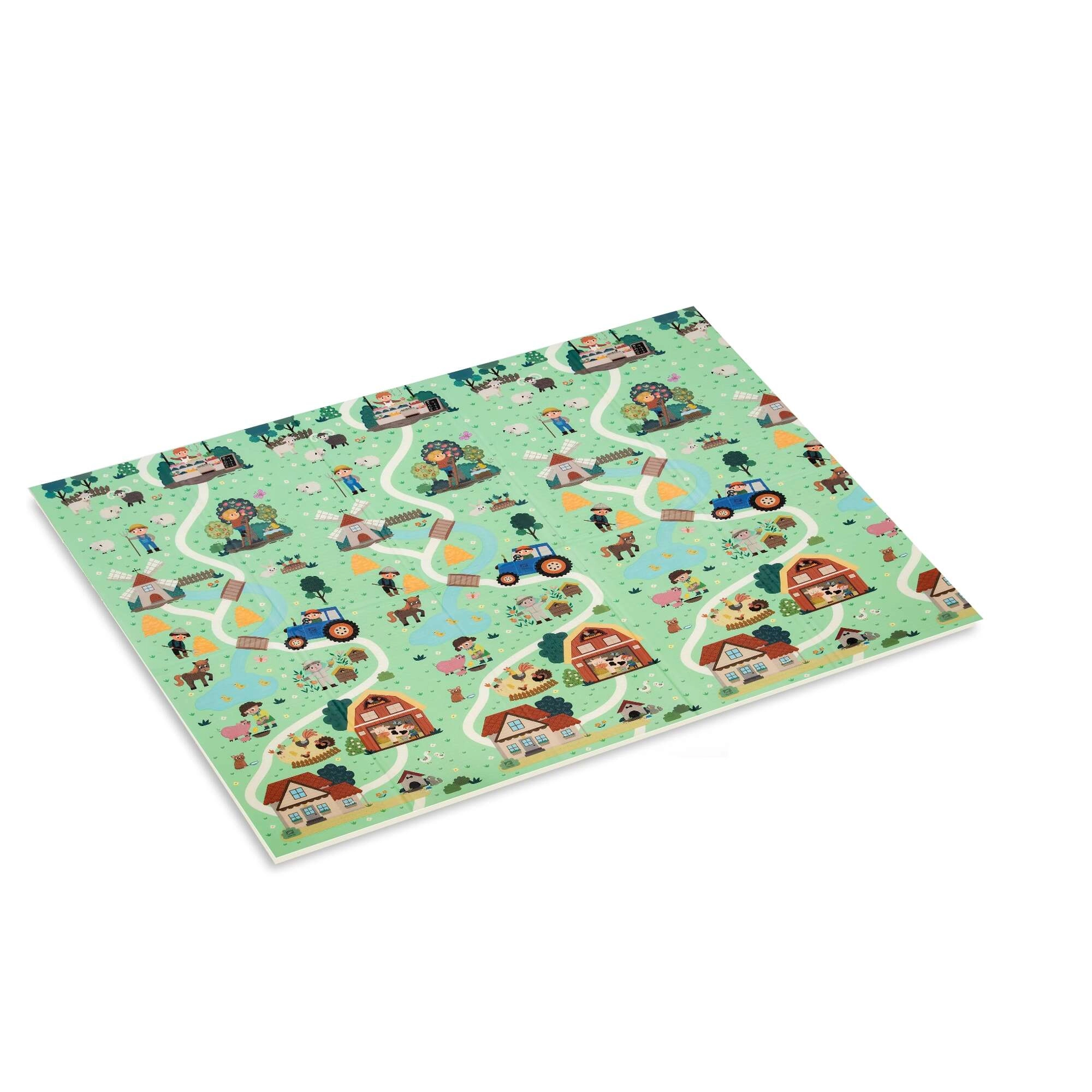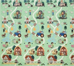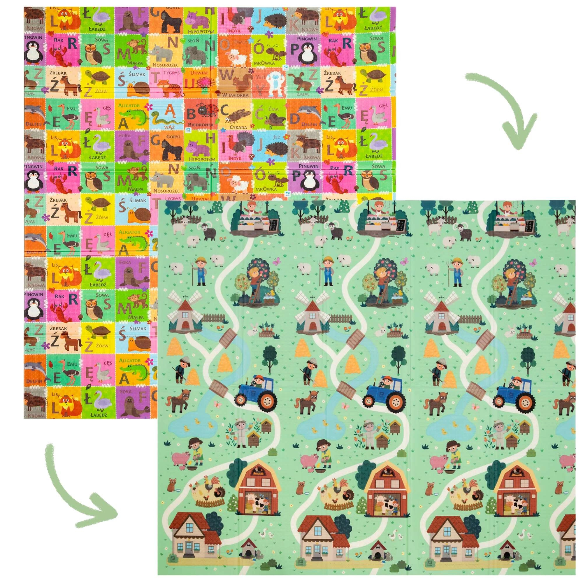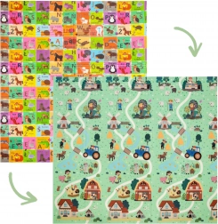 Jedna strana s barevnou abecedou a zvířátky podporuje rozvoj slovní zásoby, druhá strana s motivem farmy a cest je ideální pro hru s autíčky a fantazii.