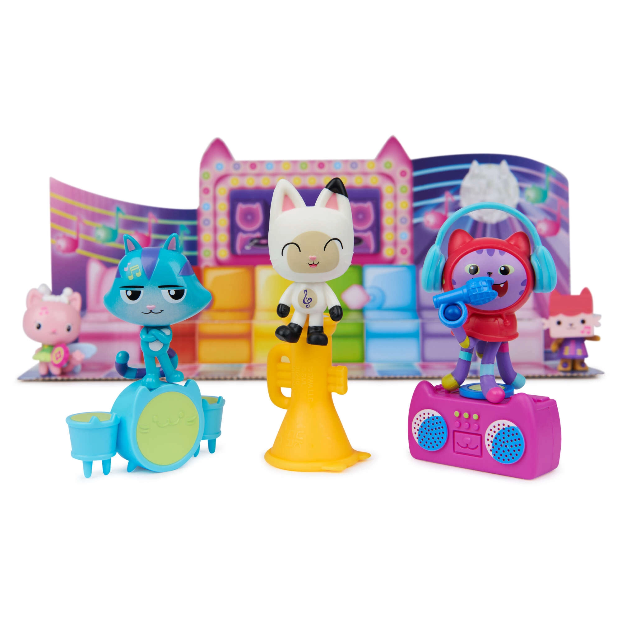 Postavičky z GABBY'S DOLLHOUSE s odnímatelnými doplňky sedí, stojí a pózují s instrumenty – perfektní pro role-play a scénky ze seriálu.