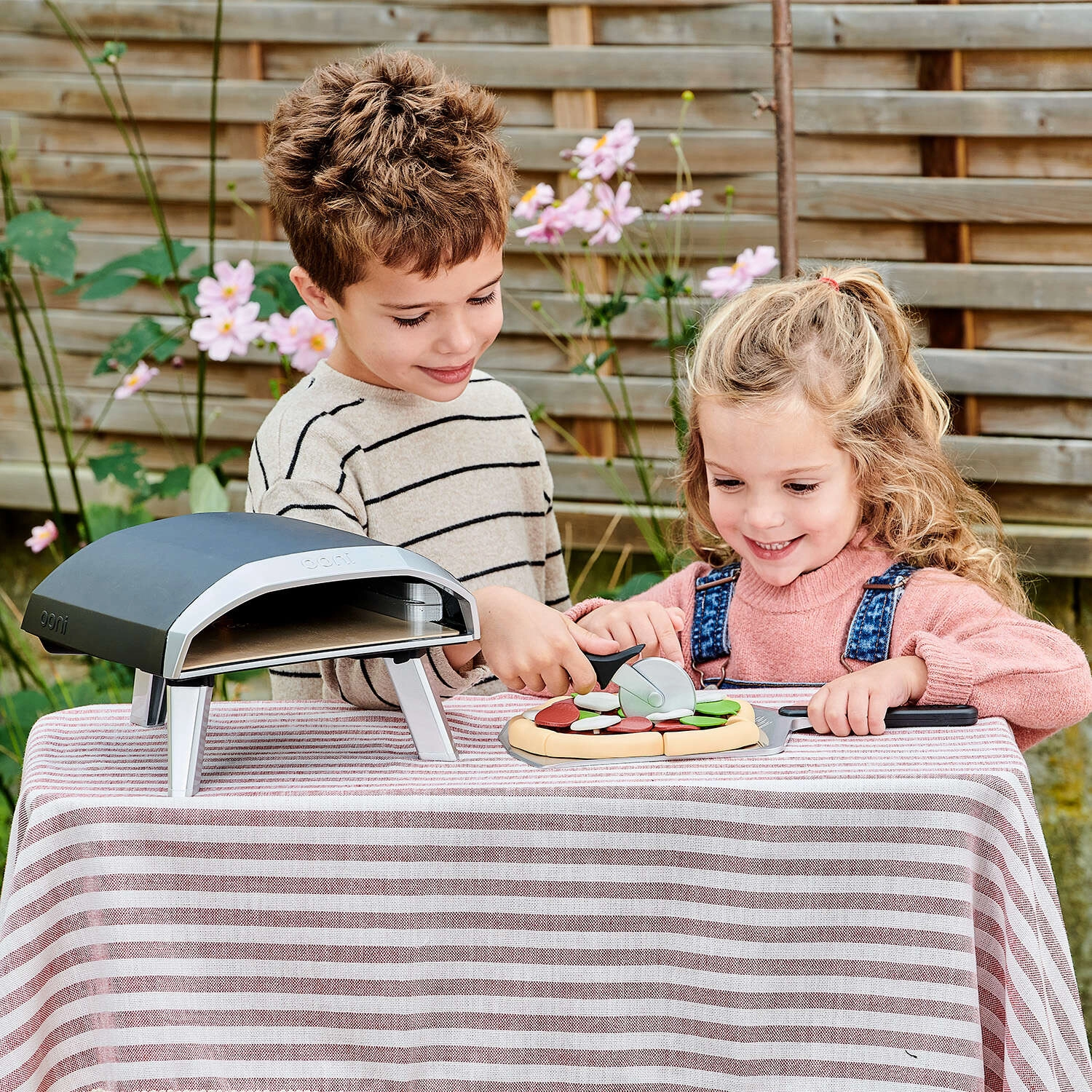 Praktická pizza lopatka a kráječ usnadňují manipulaci. Spoje u kousků pizzy drží díly pohromadě – ideální pro malé ruce.
