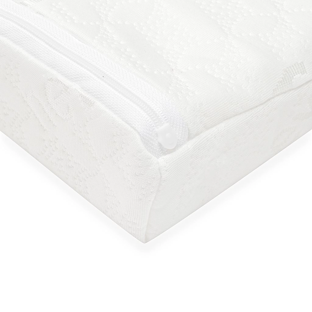 Odnímatelný potah ze 100% polyesteru je jemný, prodyšný a antialergický. Výplň z kvalitní polyuretanové pěny poskytuje stabilní oporu, přitom zůstává příjemně měkká. Rozměry 59 × 37 cm s výškou cca 7 cm v nejvyšším bodě sednou do většiny dětských postýlek.