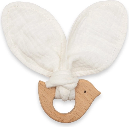 Dětské kousátko NEW BABY Bird white spojuje přírodní bukové dřevo a jemnou mušelínovou tkaninu ze 100% organické bavlny. Tvrdší dřevěná část pomáhá masírovat dásně a ulevit od napětí, zatímco měkký mušelín poskytuje hebký dotek a možnost jemného otření slin.