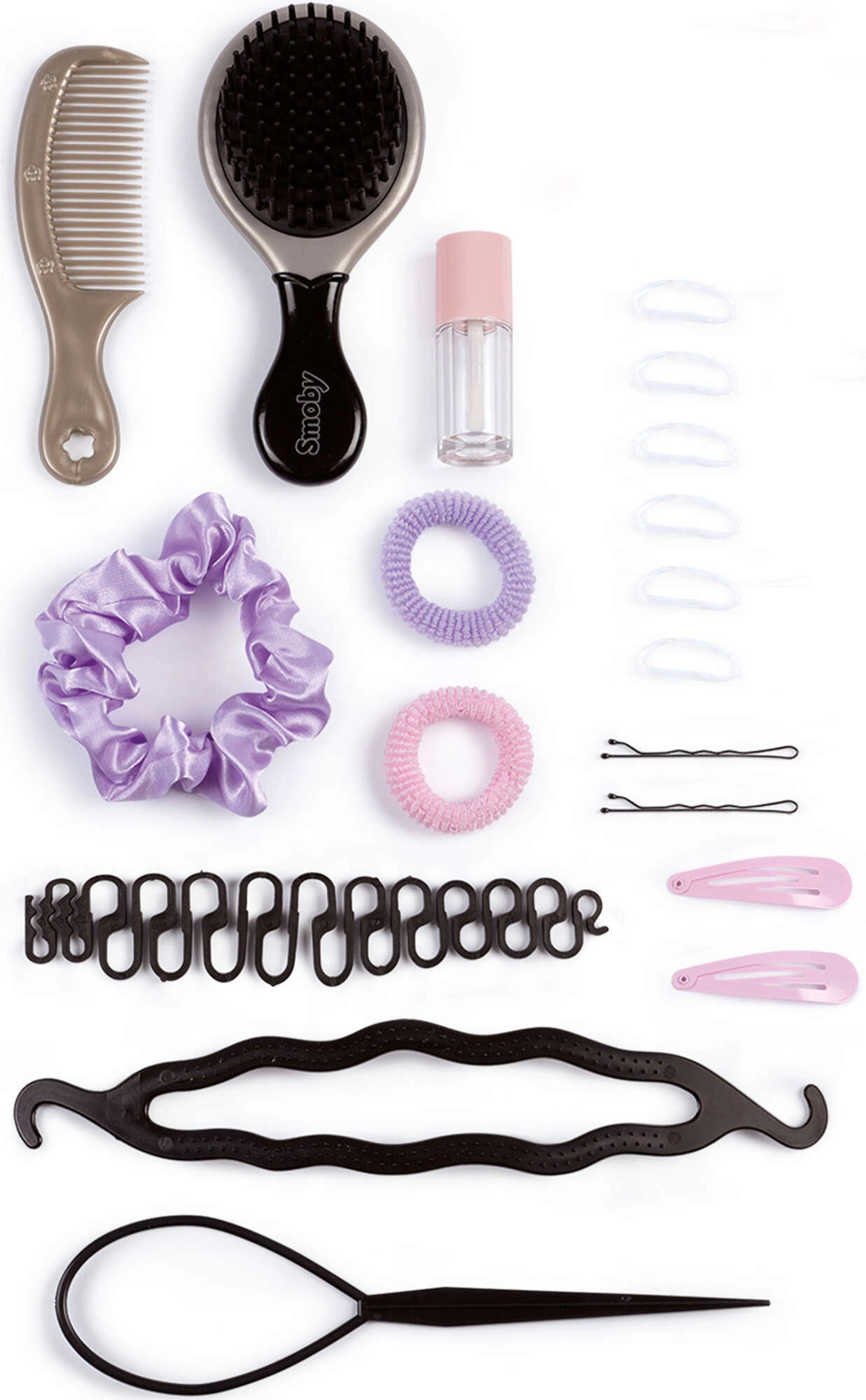 Kartáč, hřeben, gumičky, sponky, pinetky, průhledné gumičky a speciální pomůcky na zaplétání pro snadné tvoření účesů.