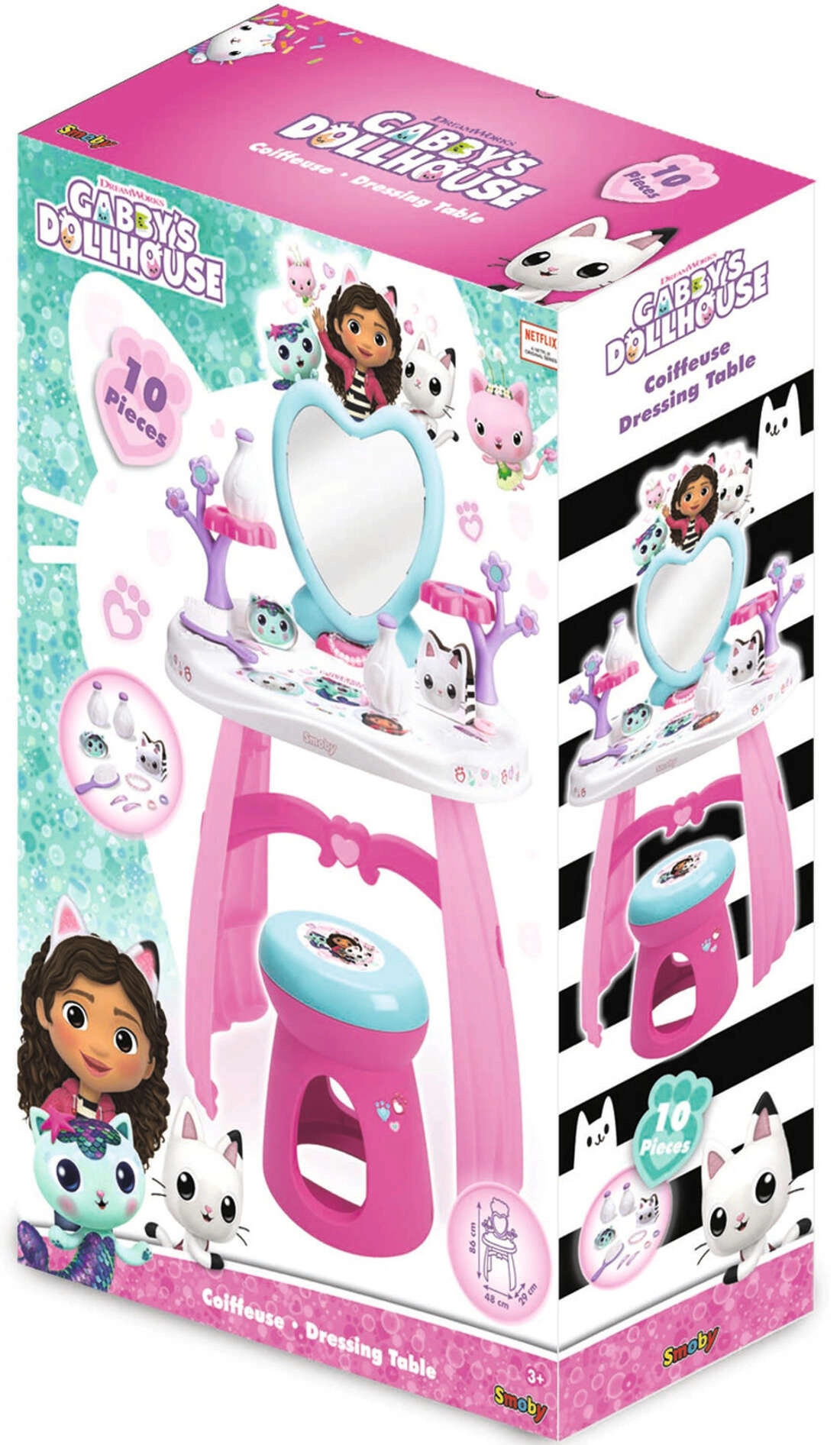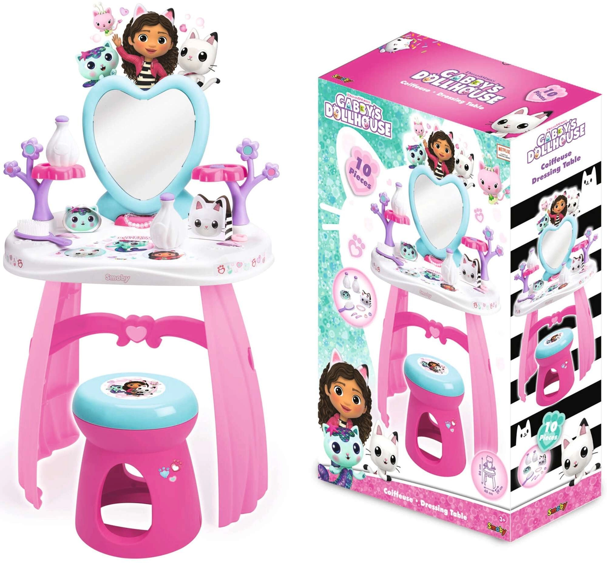 Vytvořte si doma vlastní salon krásy s toaletním stolkem inspirovaným seriálem GABBY’S DOLLHOUSE. Pastelové růžovo‑fialové barvy, srdíčkové zrcadlo a roztomilé kočičí dekorace podněcují fantazii a podporují kreativní rolovou hru. Lehká, ale stabilní konstrukce a zaoblené hrany jsou ideální pro děti od 3 let.