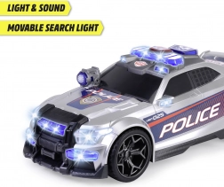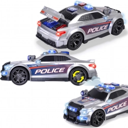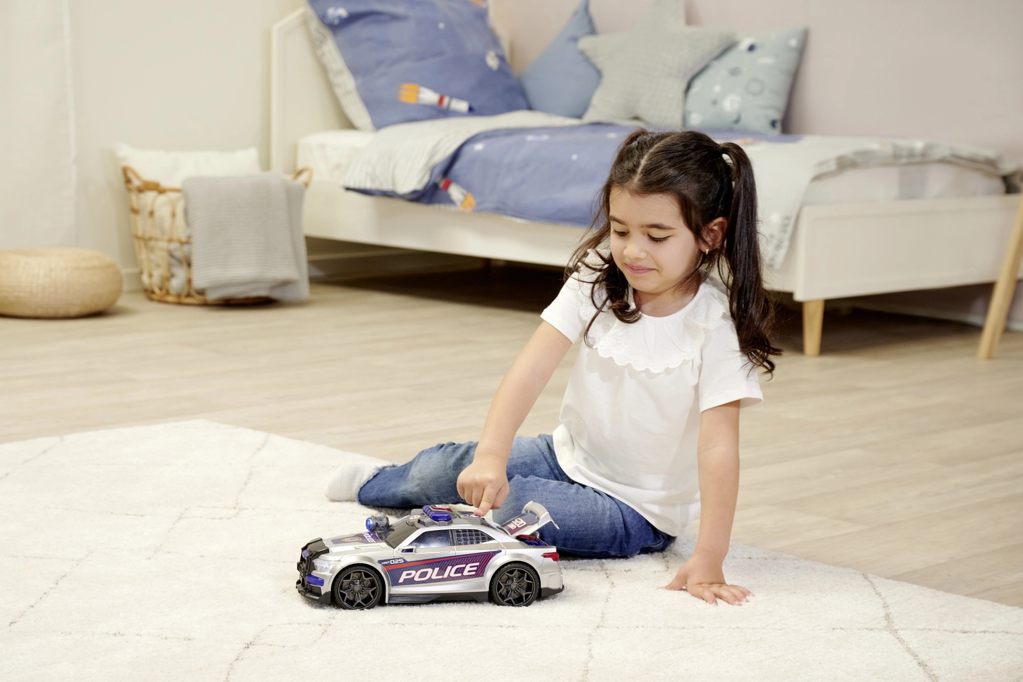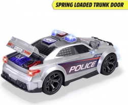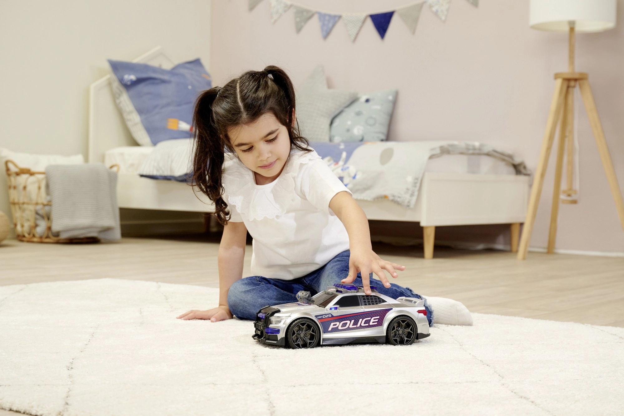 Stylové policejní auto Street Force od DICKIE TOYS přináší dětem realistickou akční zábavu. Má světelné a zvukové efekty, robustní konstrukci a velká kola pro plynulou jízdu po podlaze. Aktivace probíhá tlačítkem na střeše, kdy se rozsvítí modrá a červená světla a spustí sirény – ideální pro fantazijní hru na policisty.