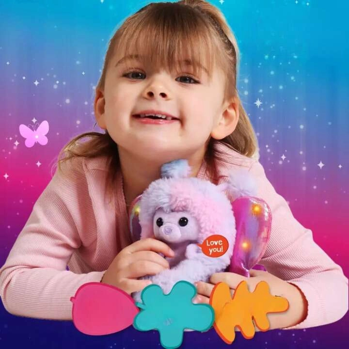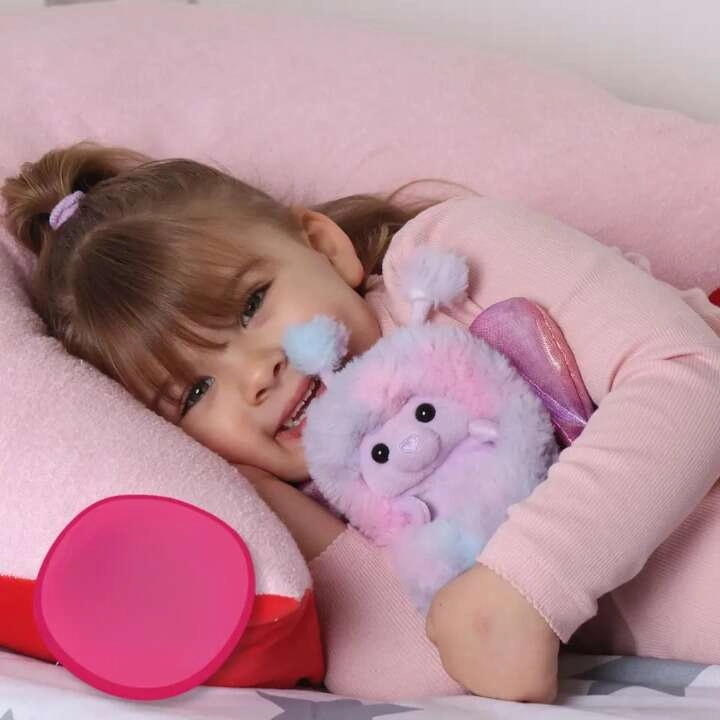 Bella je interaktivní plyšák, který reaguje na doteky – stačí ji jemně stisknout bříško, pohladit nebo dotknout se nosu a začne vydávat více než 45 zvuků: směje se, posílá pusinky a roztomile říká „I love you“ (anglicky). Díky výšce 18 cm se skvěle drží v ruce a je ideální na mazlení před spaním.