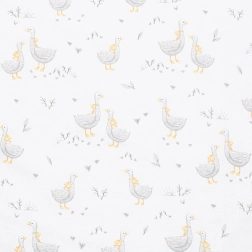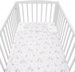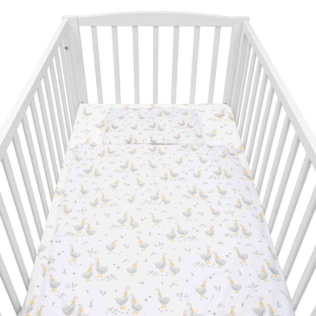 Součástí setu je polštářek 60 × 40 cm a peřinka 90 × 120 cm s uklidňujícím vzorem husiček. Materiály jsou stálobarevné, bez škodlivých látek a nebarví. Údržba je jednoduchá – stačí prát v pračce. Pro sladěný vzhled pokojíčku lze dokoupit i další produkty z kolekce Husičky.