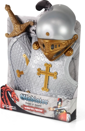 Sada obsahuje vše, co malí rytíři potřebují pro naplnění svých hrdinských snů – meč s pochvou, štít, helmu a vestu.