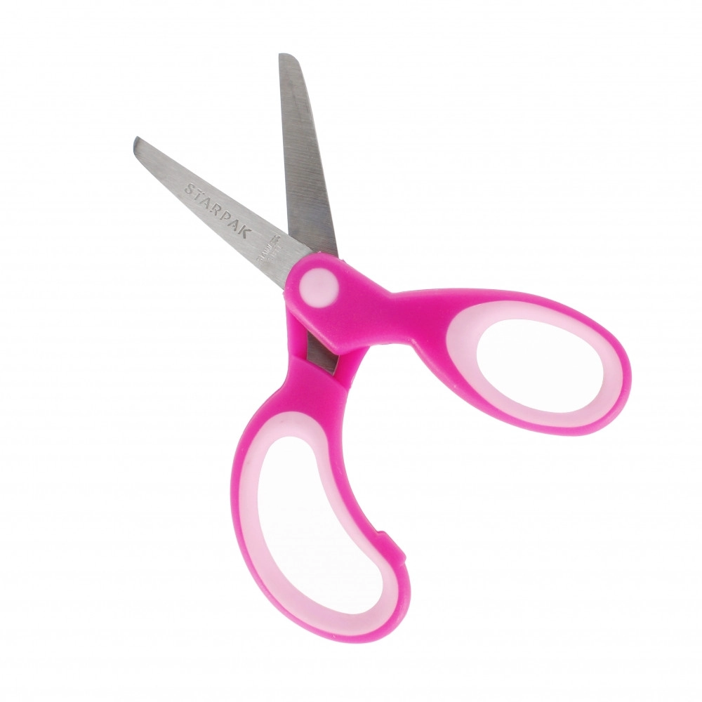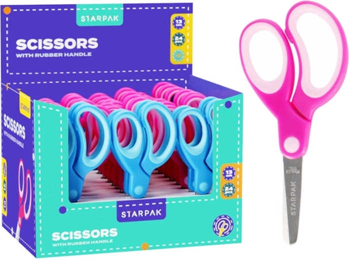Praktické školní nůžky o délce 13 cm ideální pro malé dětské ruce. Díky ergonomickým rukojetím a zaobleným hrotům jsou bezpečné pro děti od 3 let, skvělé pro stříhání papíru a tvoření. K dispozici je více barevných variant, balení po 24 kusech, cena za 1 ks.