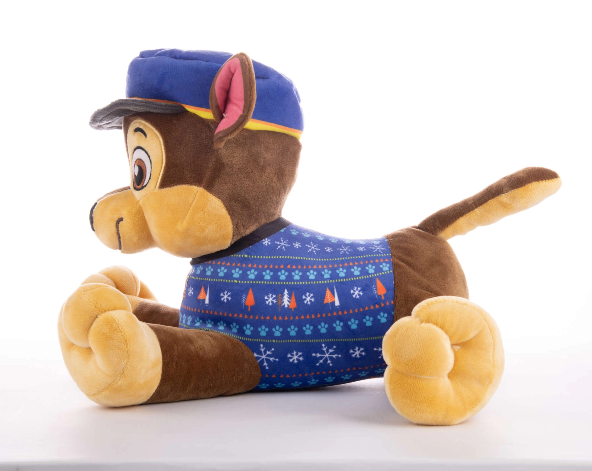 Plyšový pes policista Chase je věrně inspirován seriálem Tlapková patrola. Díky velkým vyšívaným očím, modré policejní čepici a svetrů se sněhovými vločkami a stromky působí maximálně autenticky. Ležící poloha s nataženými packami z něj dělá ideálního parťáka na objímání, spaní i hraní.