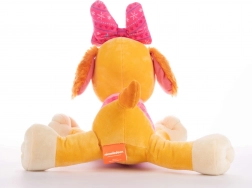 Tato velká plyšová SKYE v poloze na bříšku je stvořená k tulení a hraní. Má veselý výraz s velkými růžovými očima, na hlavě roztomilou mašli a na těle růžový svetr s motivy vloček a stromečků. Díky vyšívaným očím a nosu je bezpečná i pro menší děti.