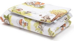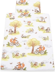 Tato oboustranná sada do kočárku spojuje praktičnost a něžný design. Jedna strana je z jemné 100% bavlny s uklidňujícím potiskem lesních zvířátek, druhá z měkoučkého velvetu, který hřeje, je příjemný na dotek a drží tvar. Ideální od narození: na spaní, do kočárku, autosedačky i jako dečka na hraní.