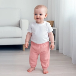 Tato dětská souprava kombinuje maximální pohodlí a praktické zpracování. Bavlněné tričko je měkké, prodyšné a díky jemnému lemu u krku netlačí ani při celodenním nošení. Mušelínové kalhoty jsou lehké, odolné a příjemné na dotek – ideální pro aktivní děti.