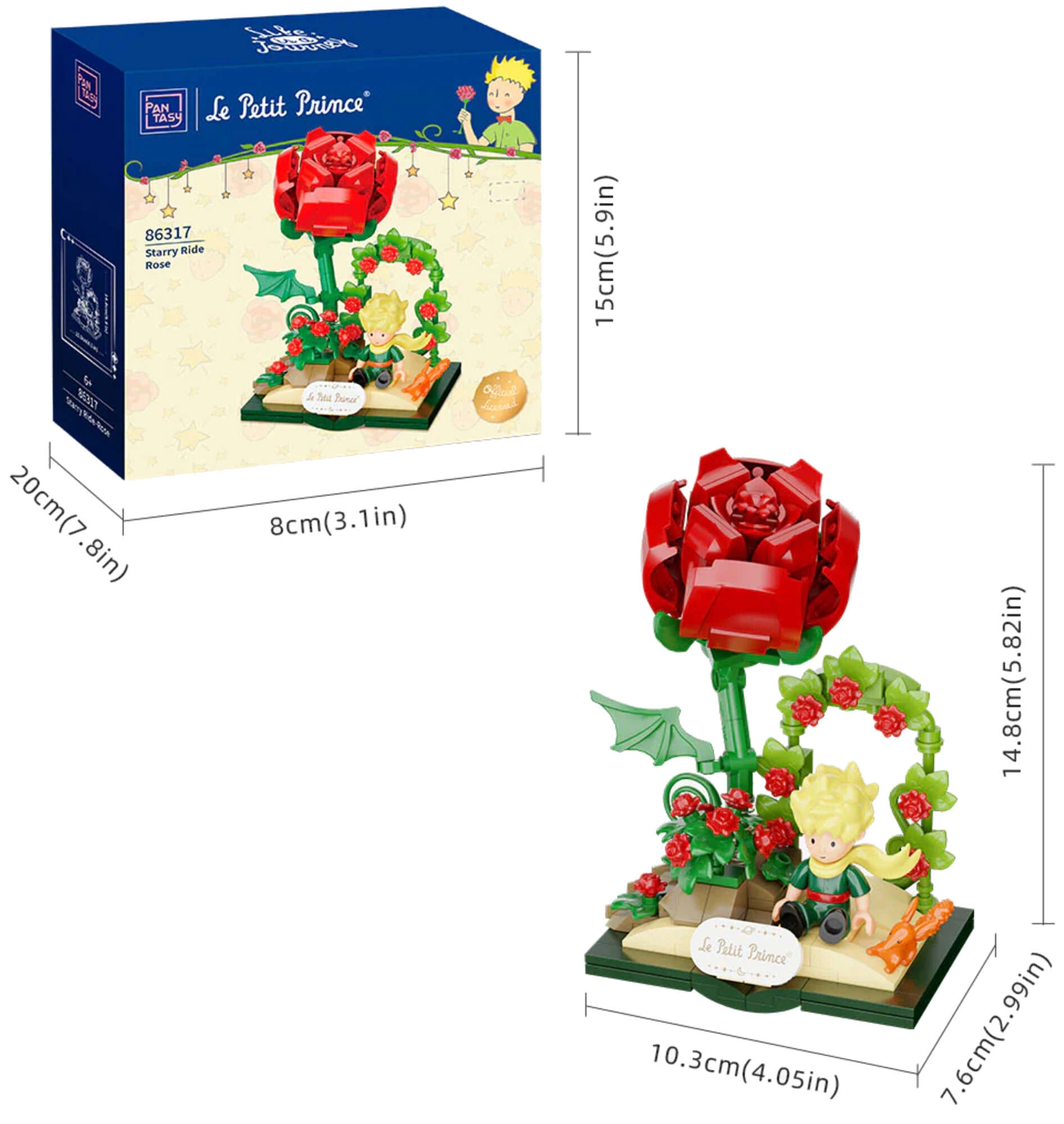 Tato designová stavebnice přináší ikonickou červenou růži a postavičku Malého prince s liškou v poetické scenérii. Díky tištěným detailům vyniknou barvy i jemné motivy a model si dlouhodobě zachová prémiový vzhled. Sestavená dekorace o rozměrech 14,8 × 10,3 × 7,6 cm skvěle ozdobí pracovní stůl, poličku i dětský pokoj.