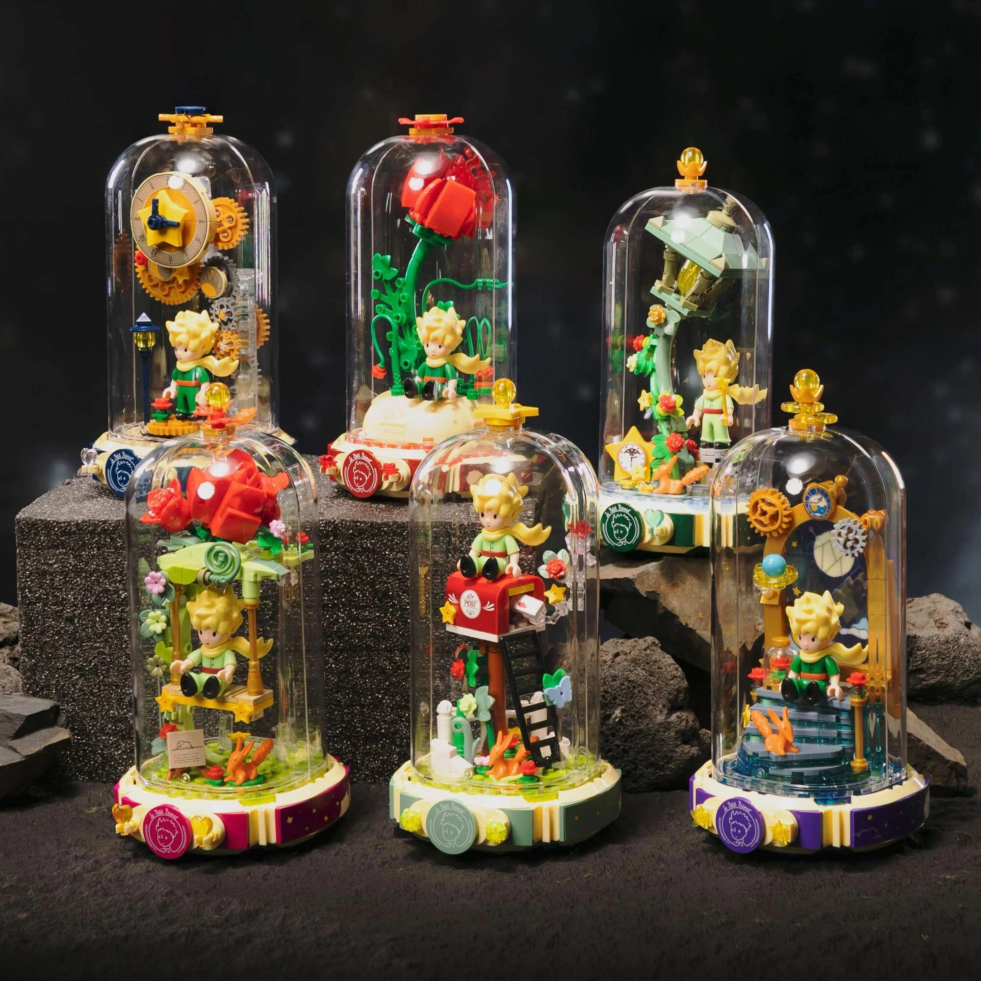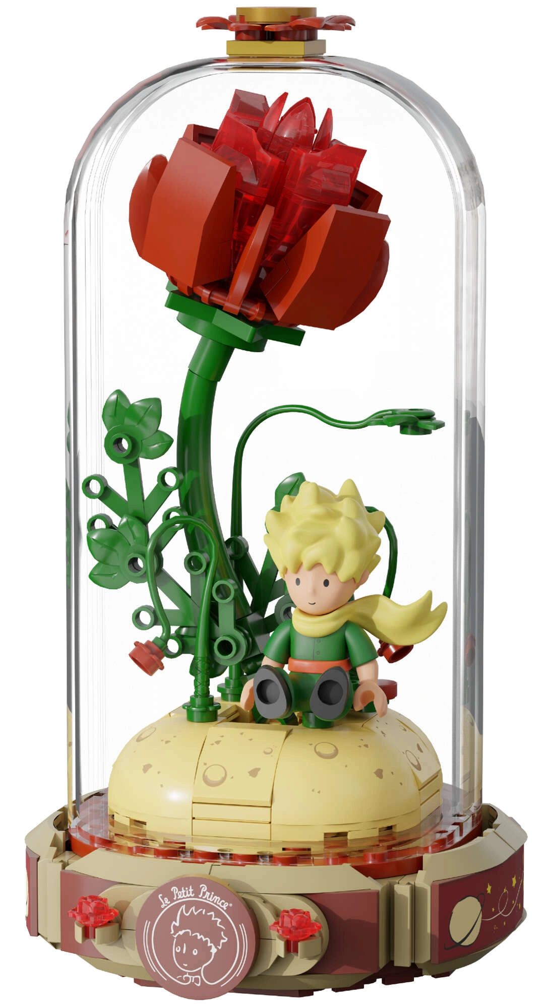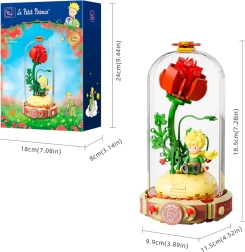 Postavte si symbolickou červenou růži na podstavci ve tvaru otevřené knihy s nápisem „Le Petit Prince“. Po boku stojí Malý princ a liška v typické póze. Vyladěné detaily stonků, listů a květů dodávají modelu harmonii a eleganci – skvělý kousek pro výstavku i tvořivou zábavu.