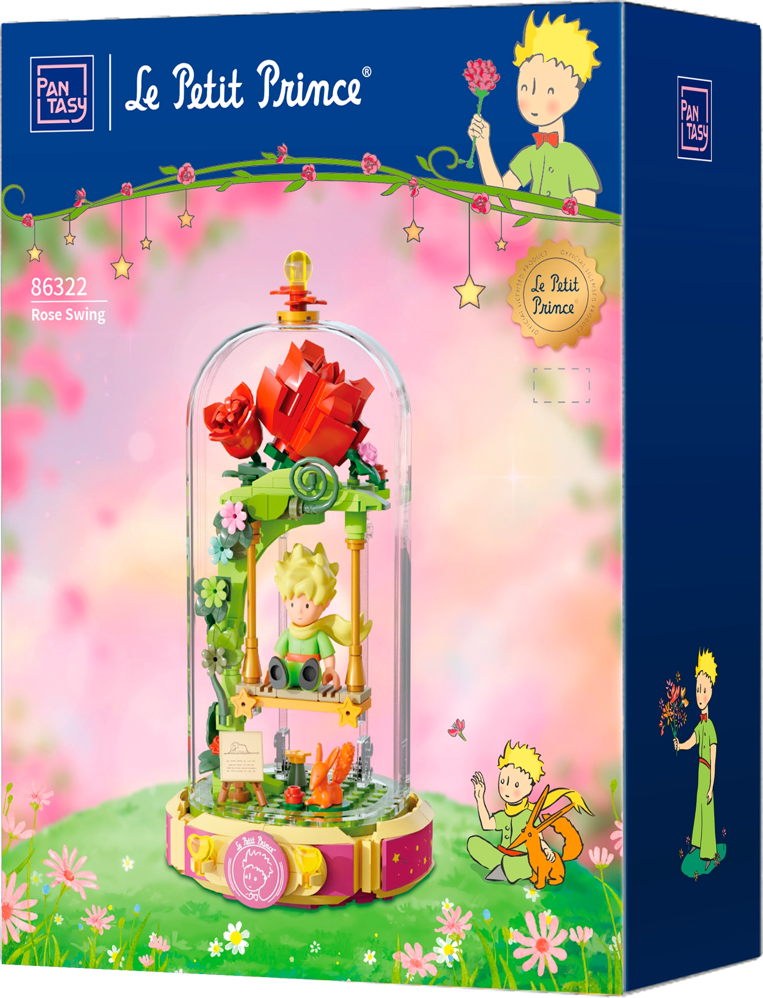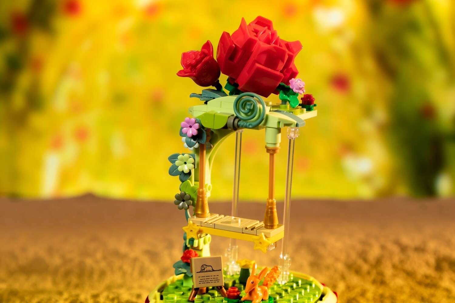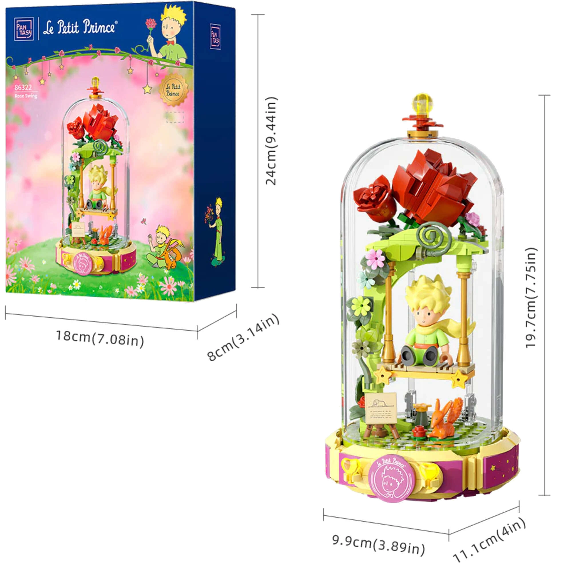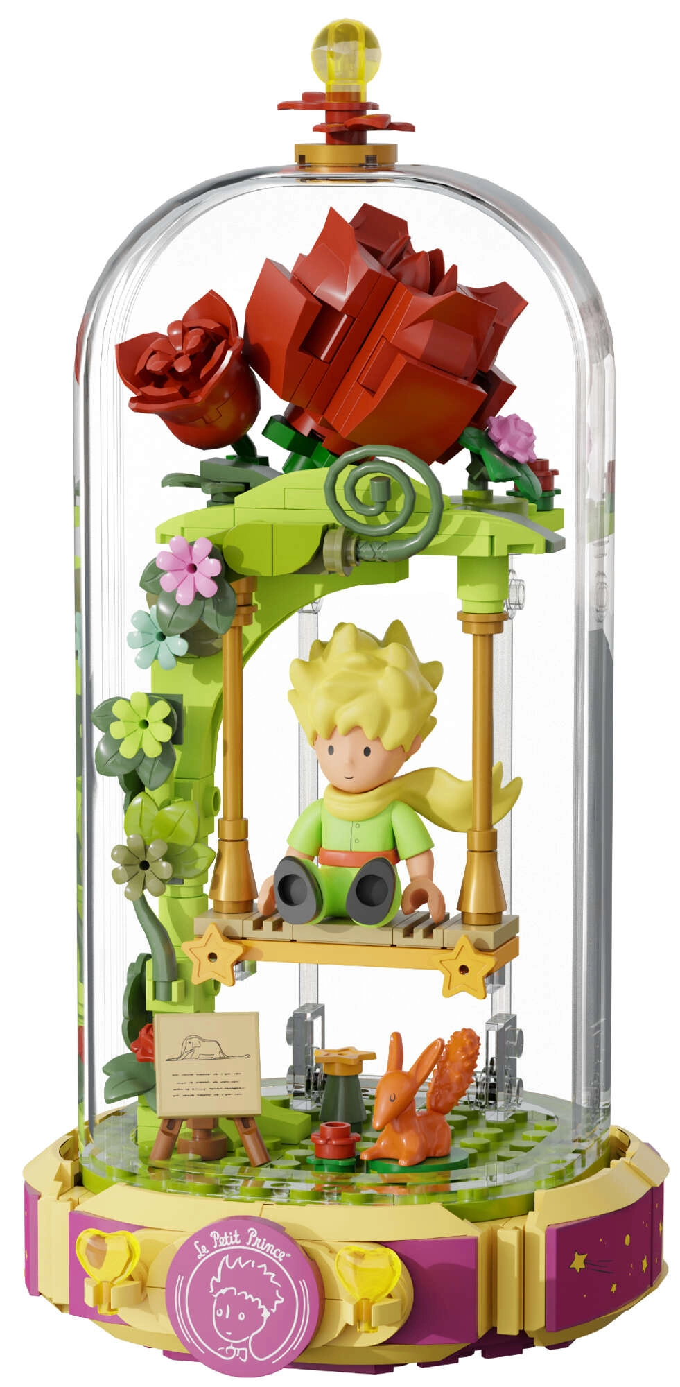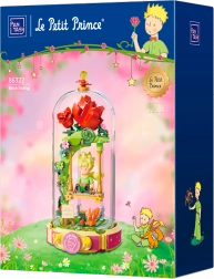 Tato designová stavebnice přenáší poetiku knihy do jemné diorámy: Malý princ sedí na houpačce pod růžovým obloukem, obklopen květinami, lístky a hvězdami. Scéna je chráněna průhledným krytem, takže vynikne na poličce i pracovním stole a zůstane bez prachu.