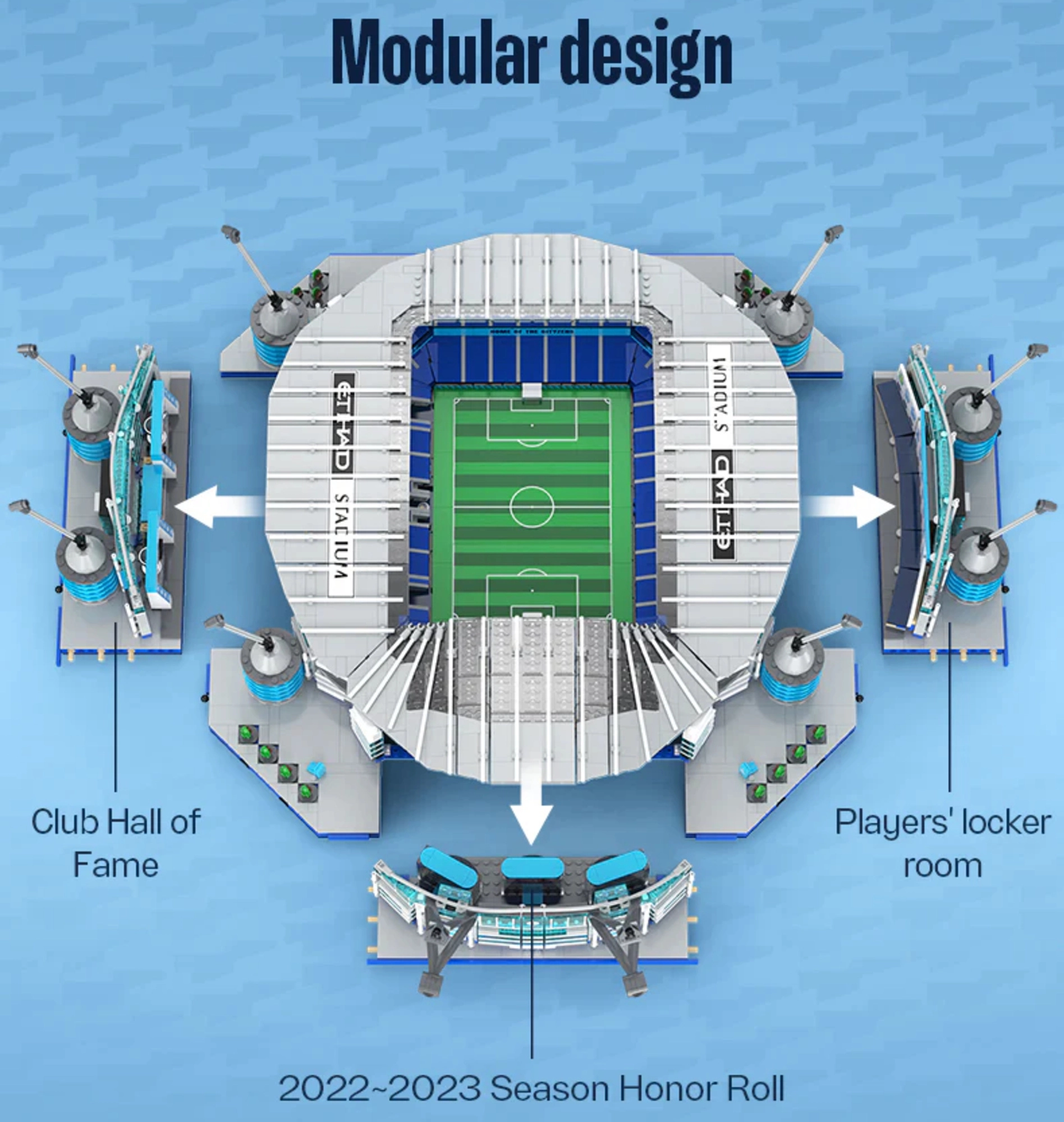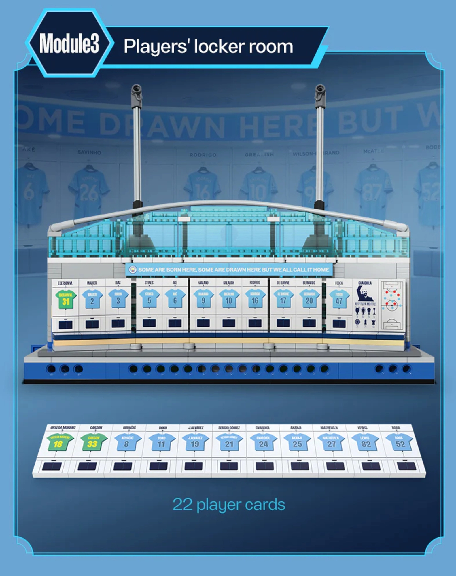 Modulární řešení umožňuje samostatně sestavit šatnu i hall of fame, takže si model užijete nejen při stavbě, ale i při prohlížení a vystavování. Díky přiloženému LED osvětlení (USB) vyniknou klíčové linie stadionu a model se stane výraznou dekorací každé sbírky.
