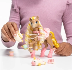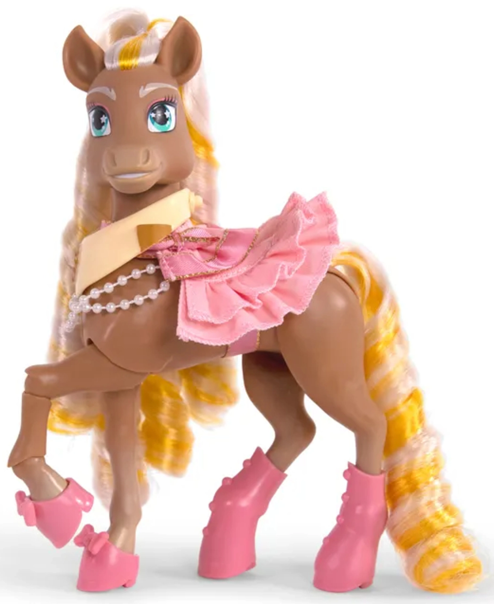 Poník s pohyblivými končetinami, dlouhou hřívou se zlatými pramínky a možností držet doplňky díky klipsům ve tvaru podkovy.