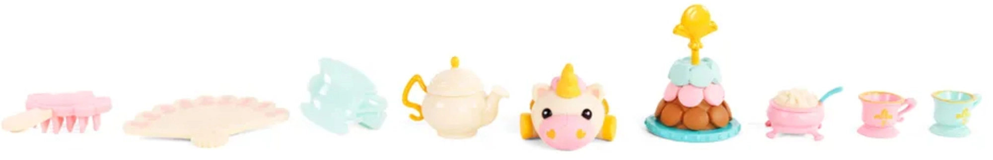V balení najdete čajový set, dezerty, hřebínek, malého jednorožce a další drobnosti pro rozmanité scénky.