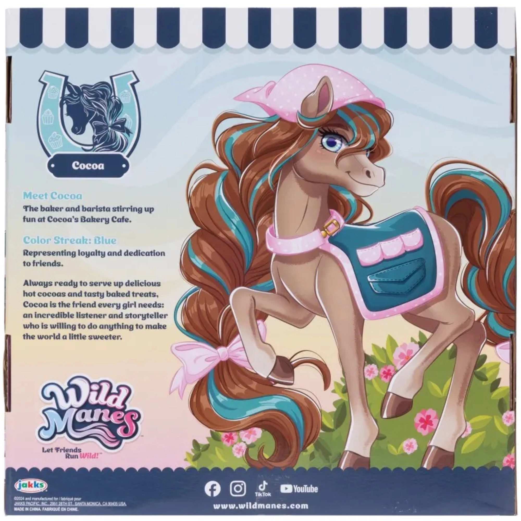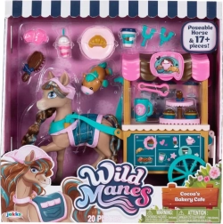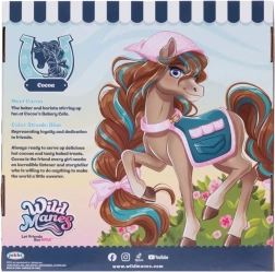 Koník Cocoa z oblíbeného seriálu WILD MANES přichází s propracovaným vozíkem Bakery Café, kde může servírovat nápoje a zákusky. Figurka má detailně zpracovanou hřívu s copánky, výrazné oči a nosí stylovou zástěrku – připravená na každé dobrodružství. Díky klipům ve tvaru podkovy může Cocoa držet doplňky a snadno tak hrát různé scénky.