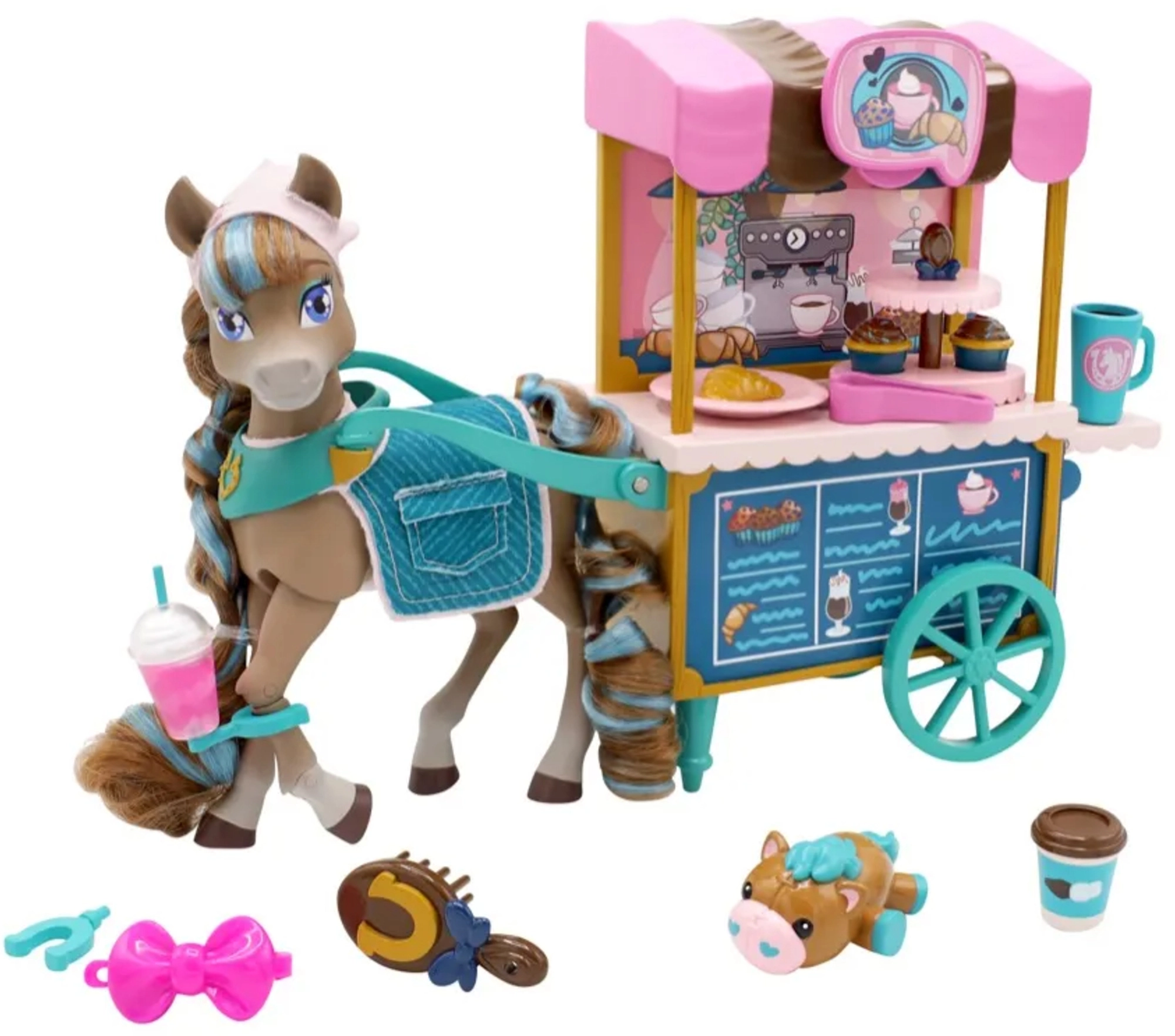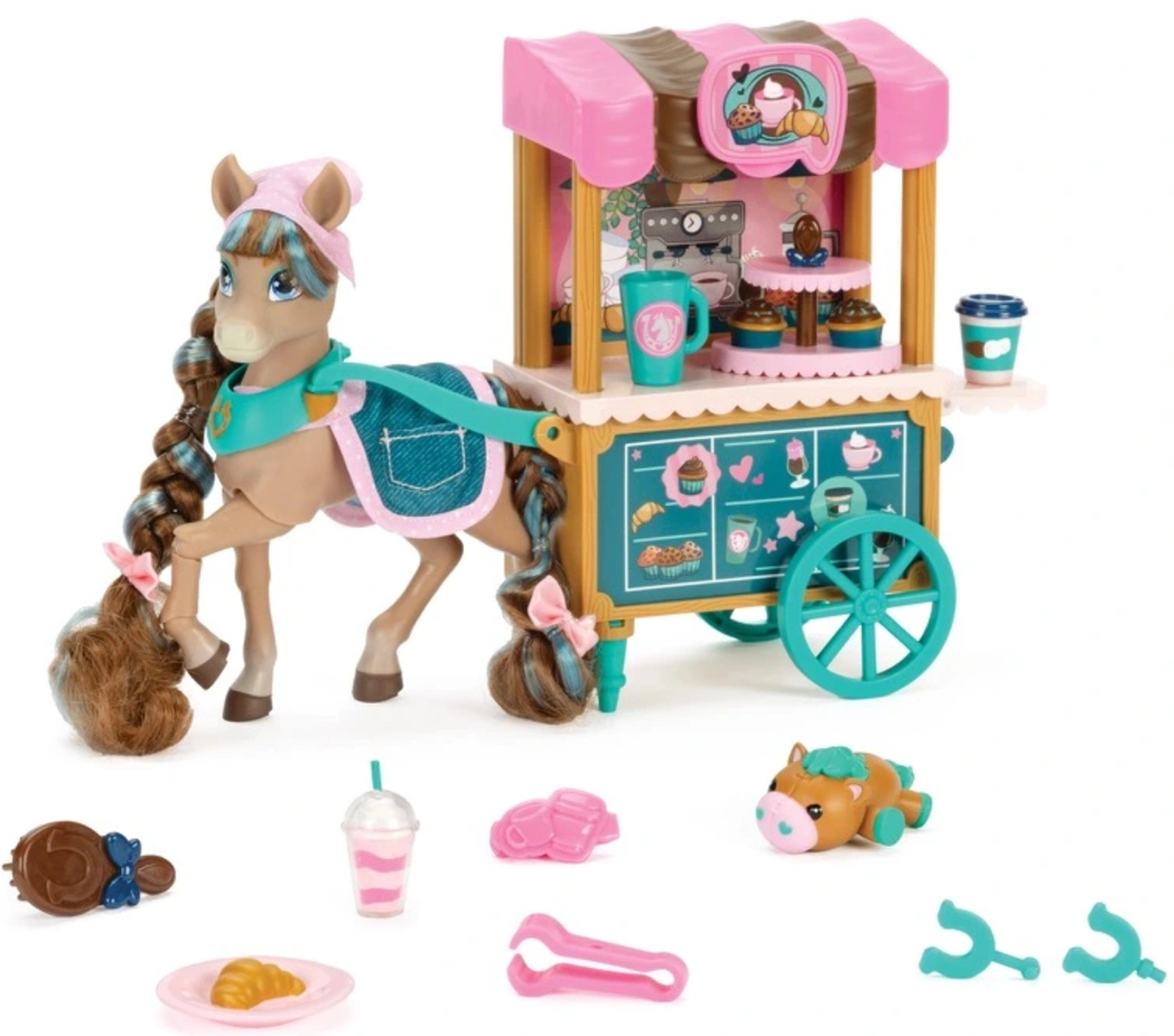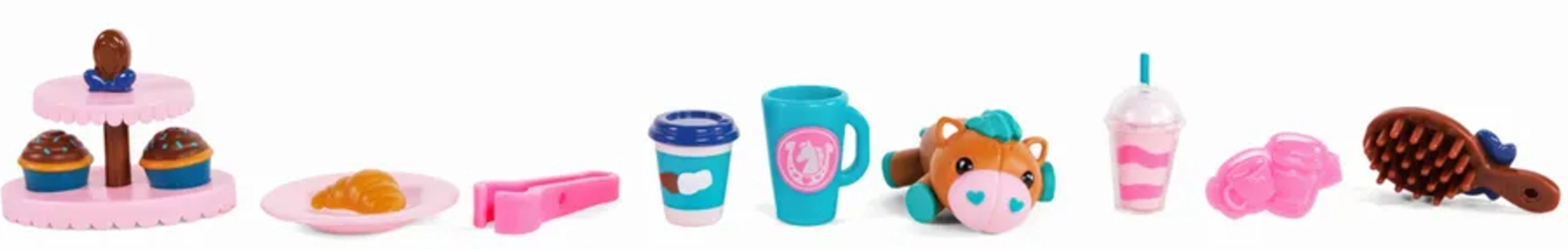 - Figurka koníka Cocoa, kavárenský vozík Bakery Café, doplňky (zákusky, nápoje, kartáč, stojan na cupcaky, mazlíček aj.)