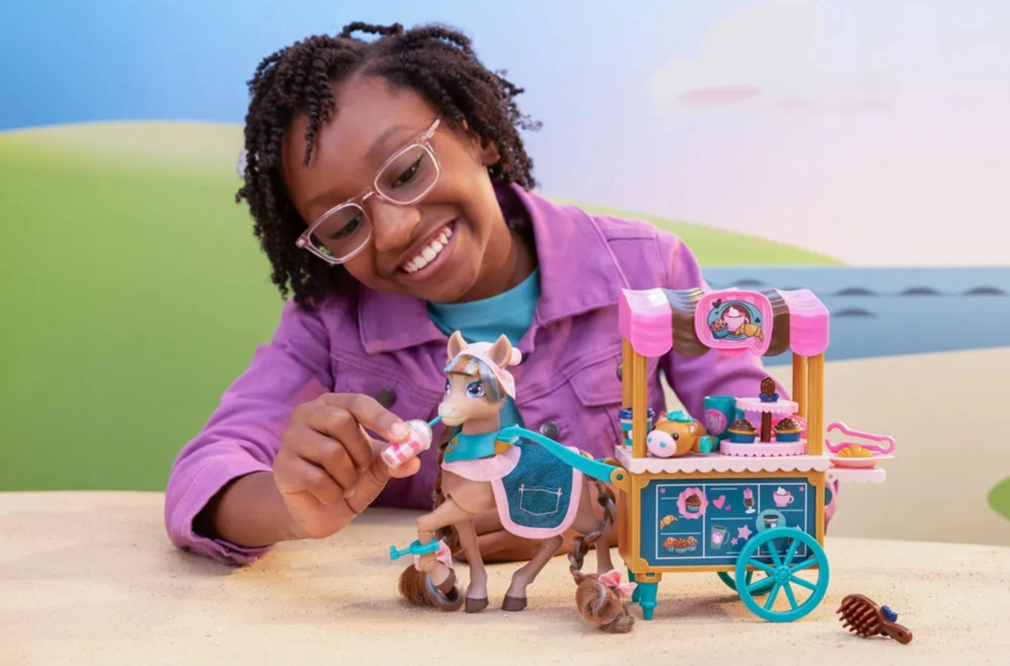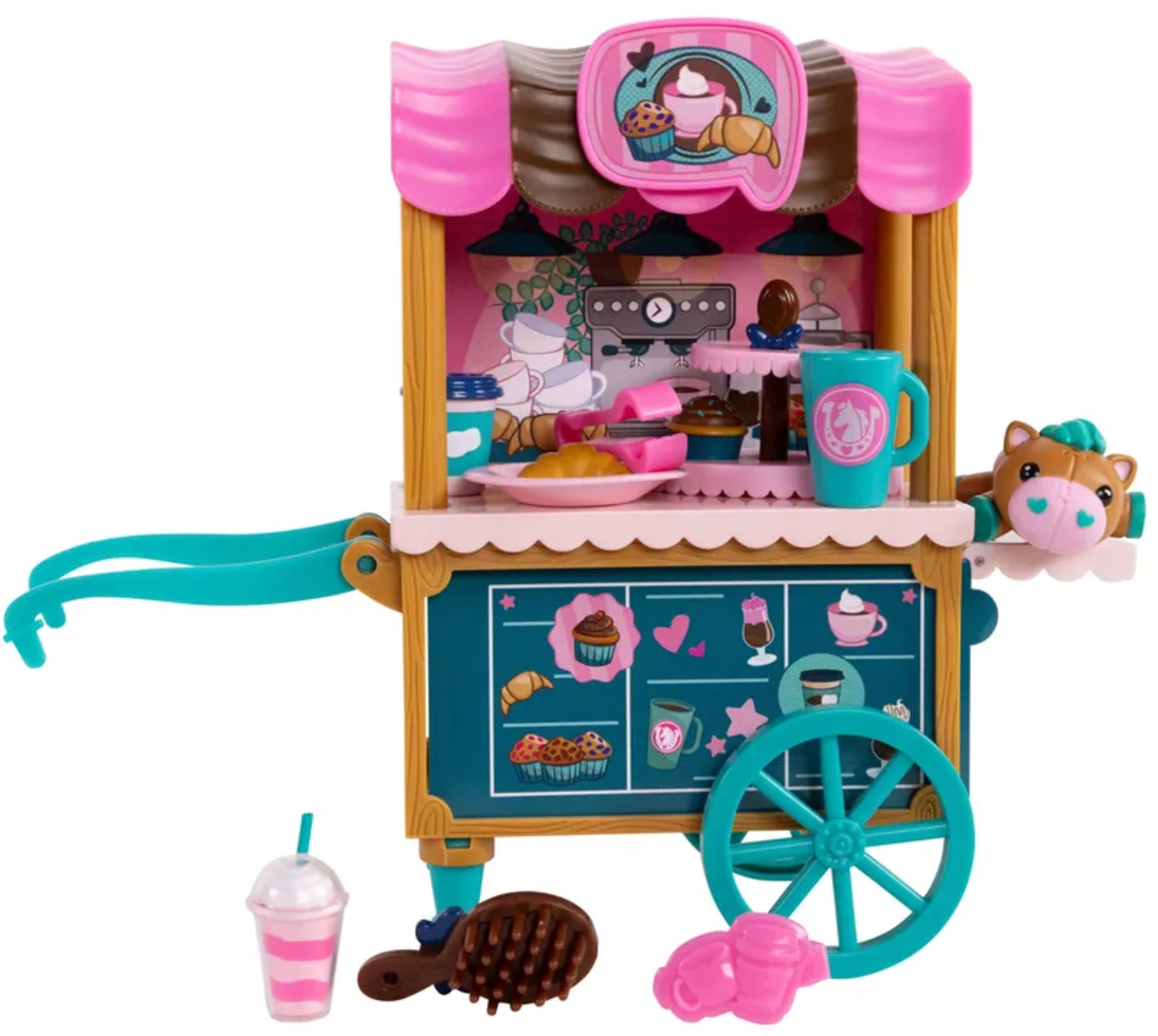 Vozík má otáčivá kolečka, madlo a poličky na dobroty, barevnou stříšku a grafiku kavárny. Set zahrnuje také servírovací a pekařské doplňky, malého mazlíčka a kartáč na úpravu hřívy. Vše je navrženo pro kreativní role-play, rozvoj jemné motoriky a sociální hry.