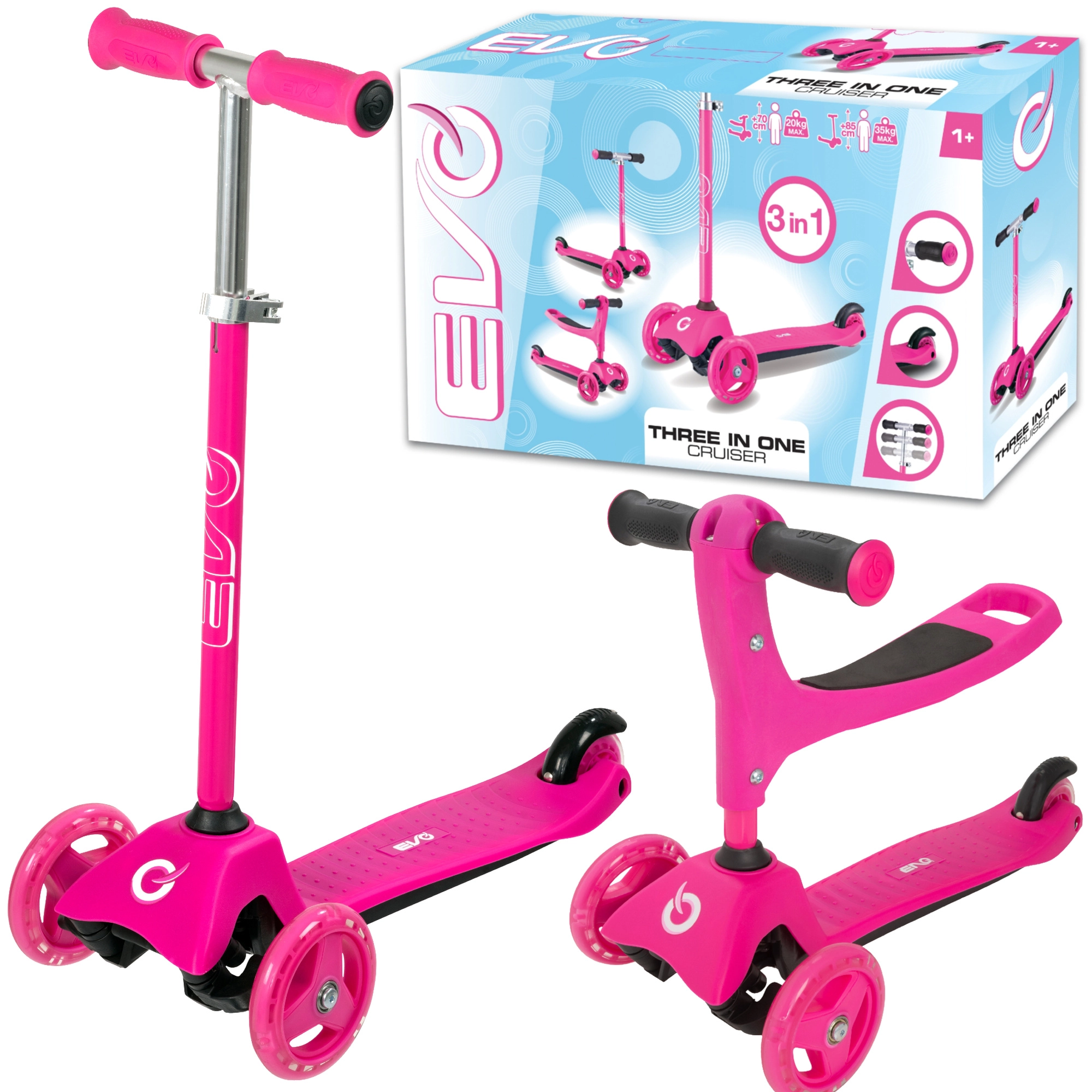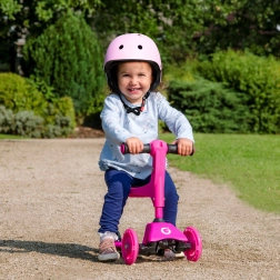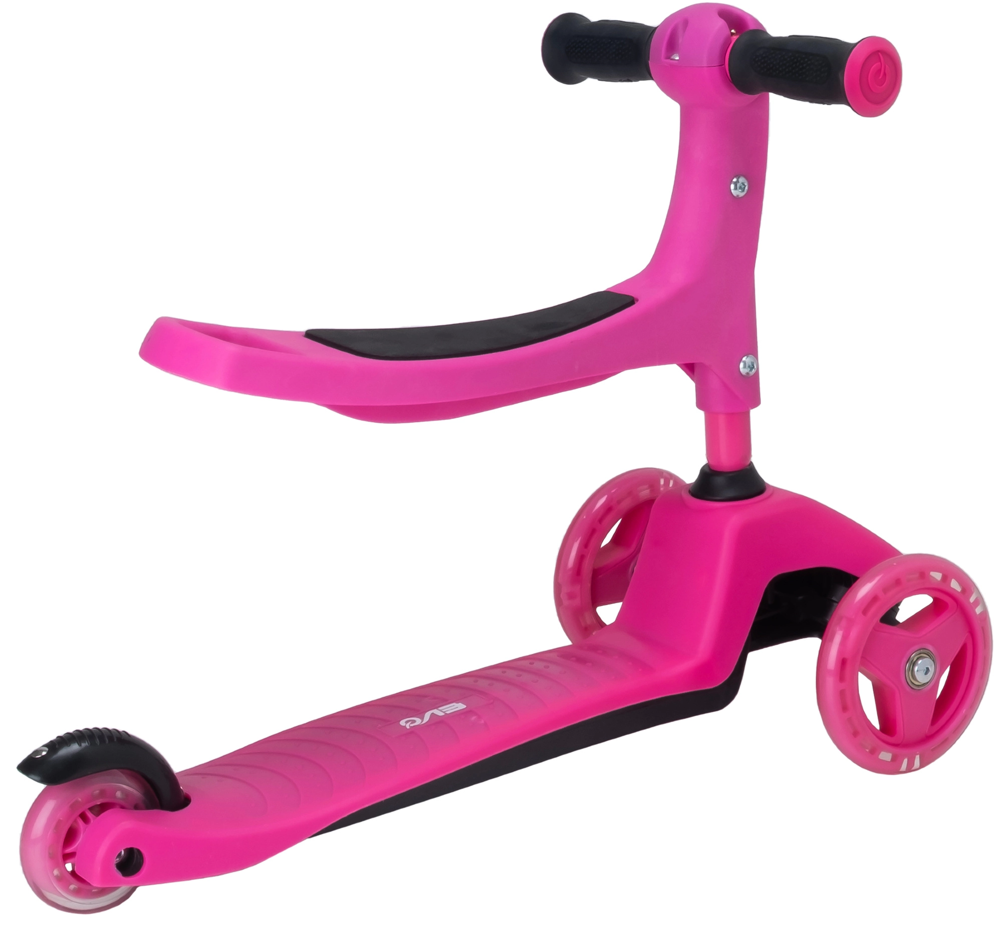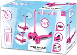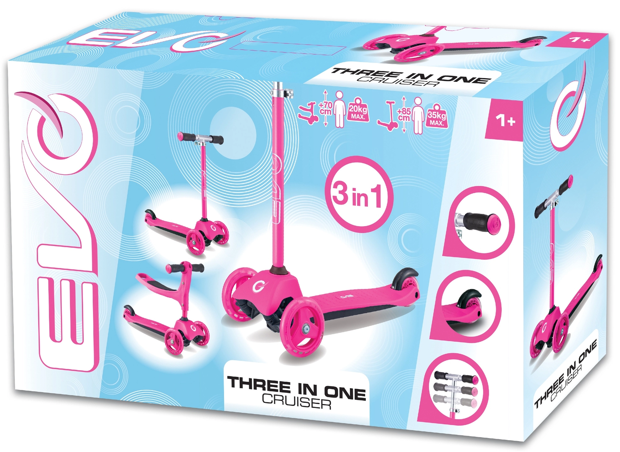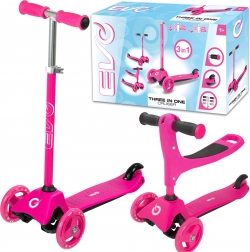 Růžová dětská koloběžka 2v1 EVO roste s vaším dítětem: během chvilky ji proměníte z jezdítka se sedátkem na stabilní tříkolku. Díky dvěma předním kolům, nízkému nášlapu a řízení náklonem nabízí výbornou stabilitu, snadné ovládání a bezpečné brzdění zadním blatníkem. Výškově nastavitelná řídítka, tichá kolečka s ložisky ABEC-5 a protiskluzová deska zajistí pohodlnou a zábavnou jízdu pro nejmenší i starší děti.
