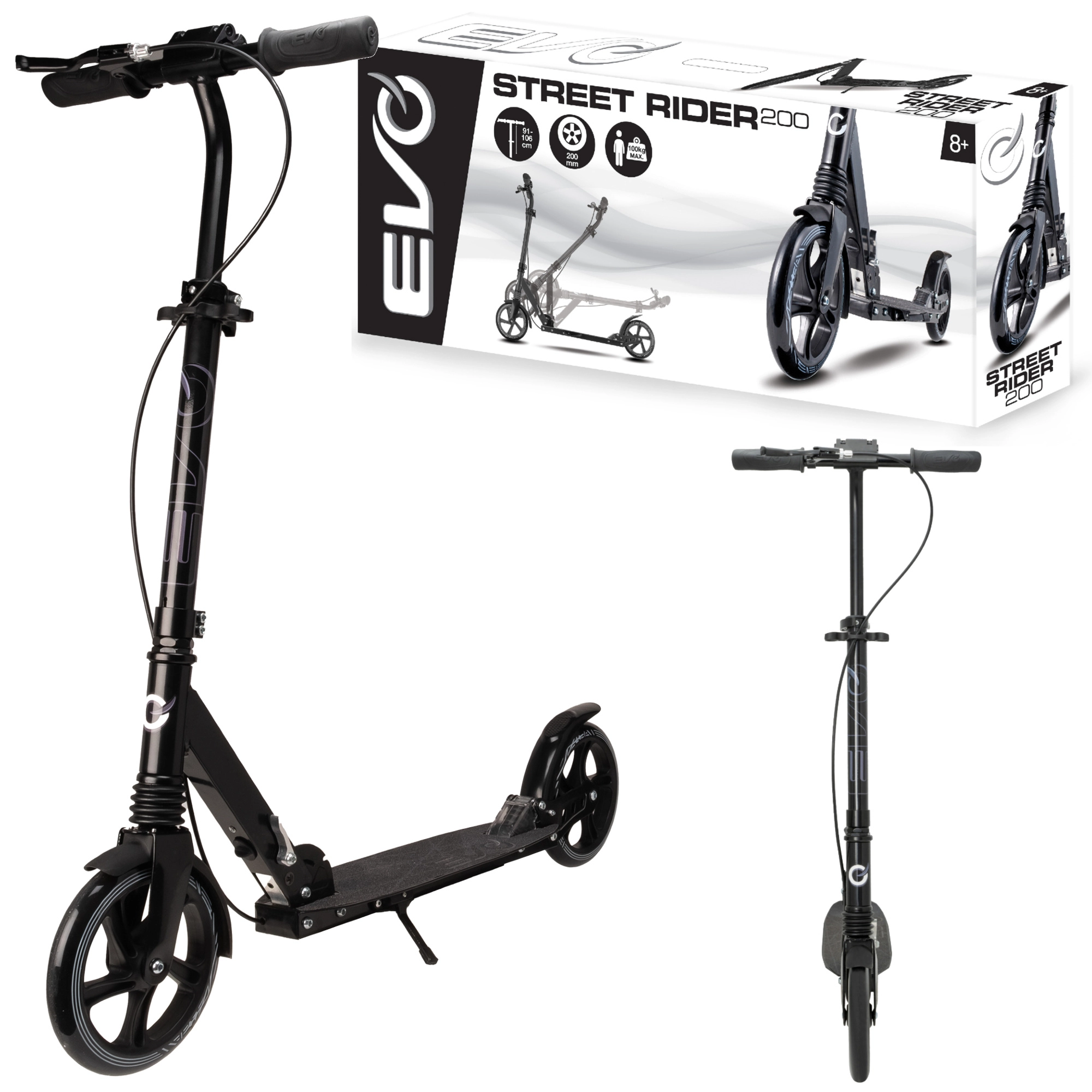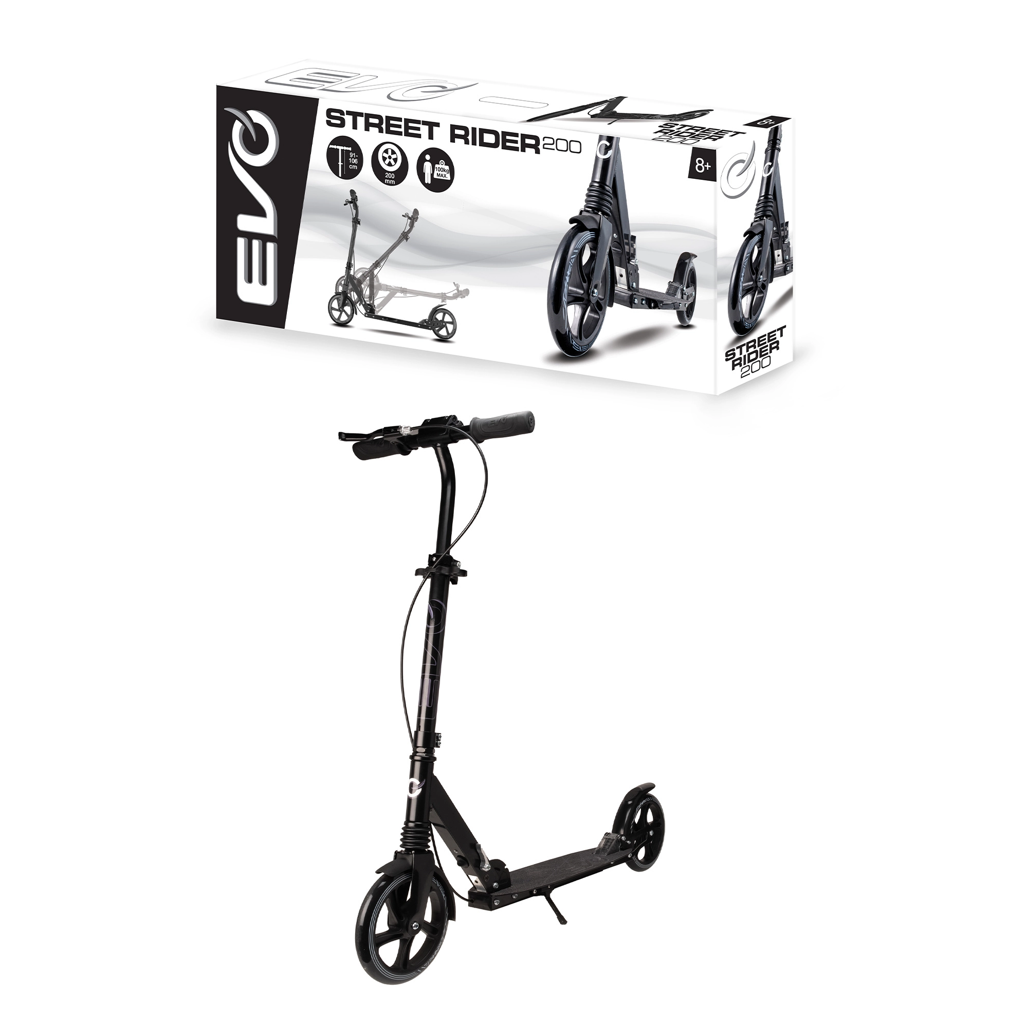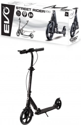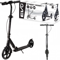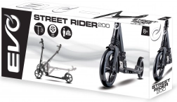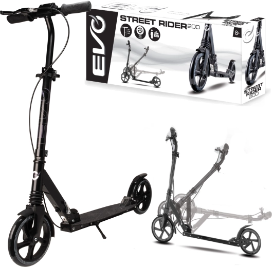 Lehká a odolná koloběžka EVO Street Rider 200 pro jezdce od 8 let nabízí velká 200mm kola, snížený valivý odpor díky ložiskům ABEC-7, přední i zadní odpružení, skládací mechanismus pro snadné přenášení a výškově nastavitelná řídítka. O bezpečné zastavení se stará zadní nášlapná brzda i přední ruční brzda, stabilitu zvyšuje protiskluzová deska a praktická integrovaná stojánka.